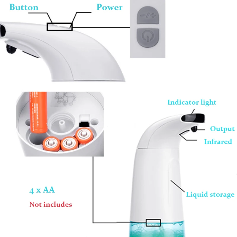 Тип: пенопластовый дозатор Материал: АБС-пластик + Поликарбонат Емкость: 250 мл Входное напряжение: 6 В постоянного тока Рабочая мощность: 1,8 Вт Водонепроницаемость: IPX4 Расстояние датчика: 3 см-5 см/1,18 дюйма-1,97 дюйма (прибл.) Аккумулятор: 4 батарейки АА (не входят в комплект)