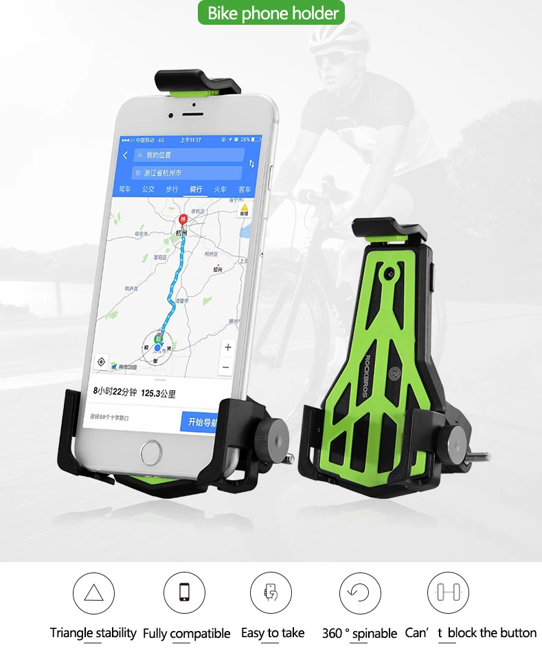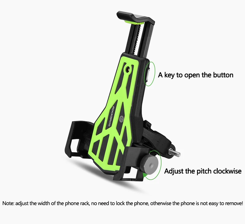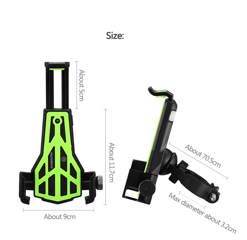 Бренд: ROCKBROS Название: держатель для телефона для велосипеда Цвет: 5 цветов Вес: около 113 г Подходит для: 3,5-7 дюймов чехол для телефона Диаметр: 15-32 мм Материал: высококачественный экологически чистый ПВХ