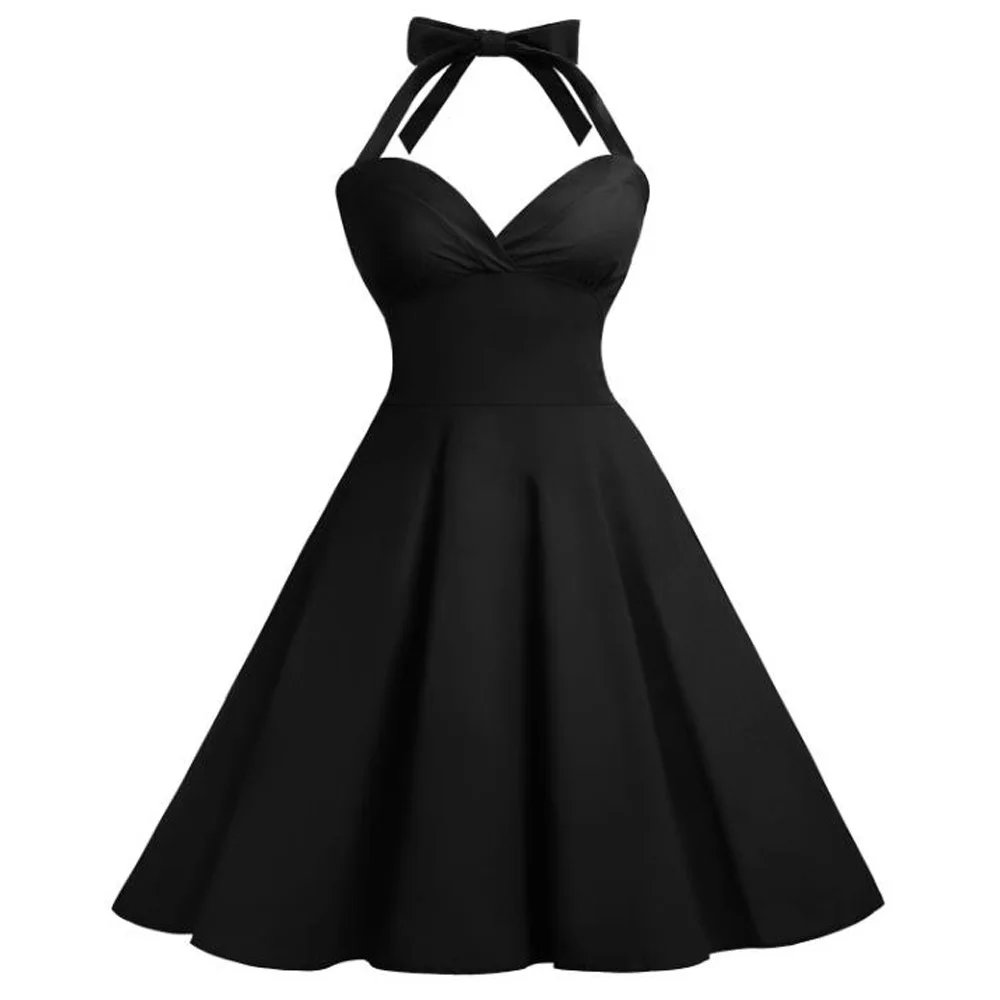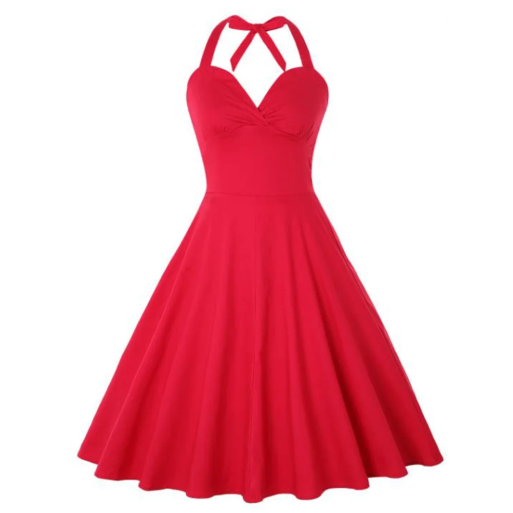 * Цвет женского платья: черный, красный, фиолетовый (как на фото) * Женское платье на 100% абсолютно новый * Летнее платье Описание: элегантное однотонное красное платье для женщин без рукавов с лямкой на шее, платье Одри Хепберн 50 s, Ретро стиль, винтажные платья Vestidos * Комплектация: 1 платье