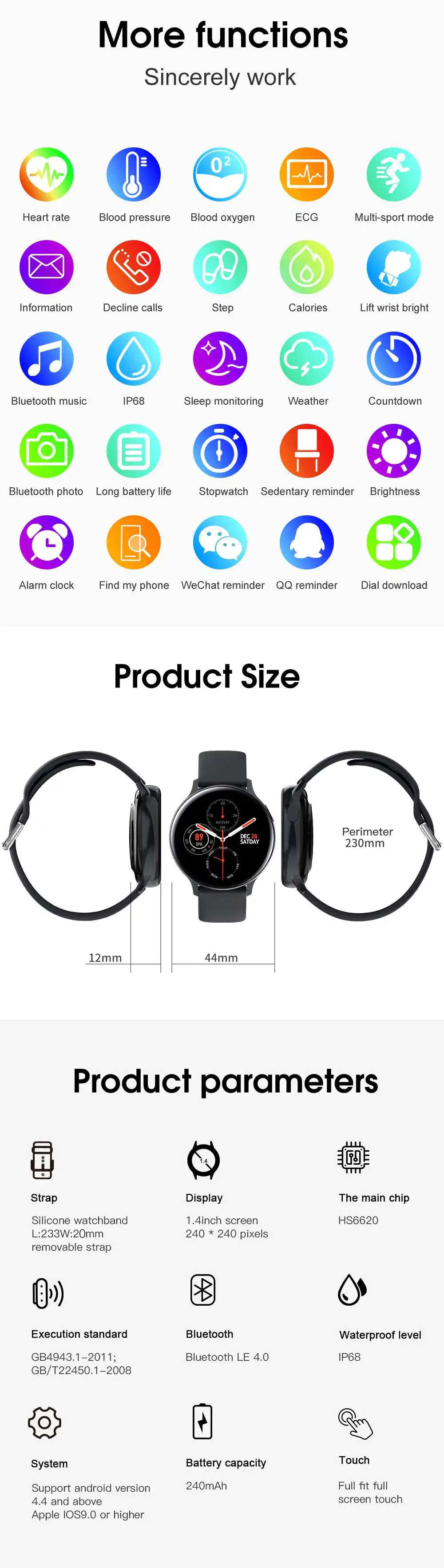 Больше функций поддерживает будильник, календарь, напоминание о сидячем положении, дистанционное управление камерой, анти-потеря, отображение погоды, управление музыкой, контроль яркости