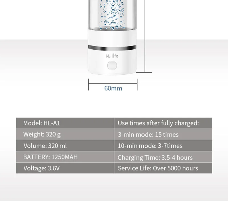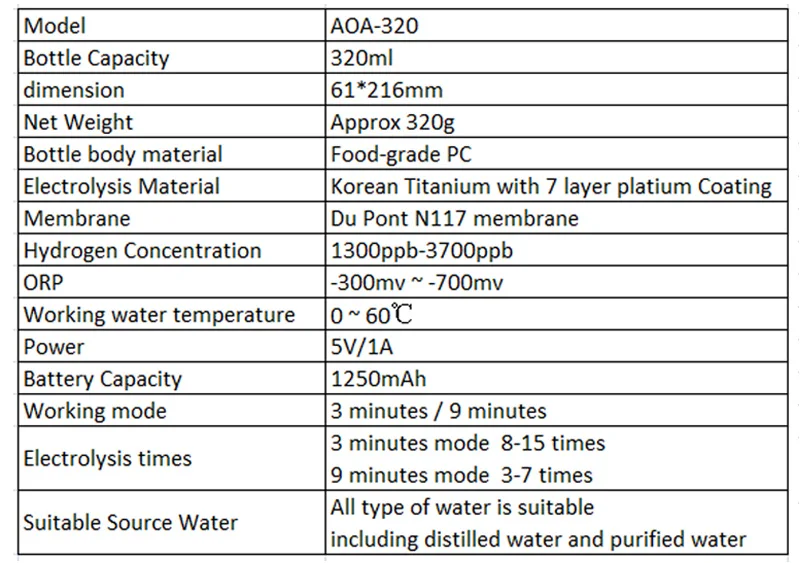 С помощью передовых технологий и точной структуры, концентрация водорода, производимого нашей бутылкой, может достигать 1900ppb за 3 минуты, максимум 3700ppb за 9 минут, в то время как средний уровень концентрации водорода в промышленности составляет около 1200ppb. Свободные радикалы порождают множество здоровых проблем: В теле свободные радикалы вызывают аналогичное повреждение, так как они мембранные клеточные мембраны и делают клетки чувствительными к распаду и патогенам. Эти свободные радикалы повреждаются, что является основным строительным блоком для всех тканей, и мешают им оставаться на пути, где есть много проблем со здоровьем. Водород удаляет свободные радикалы: Растворенные молекулы водорода выделяют самые вредные свободные радикалы в наших телах и нейтрализуют их, прежде чем они могут наносить больше вреда нашим клеткам. H2 дает donates электрон и связи со свободным радикалом, чтобы создать молекулу, нам нужны H20 или вода. У AOA-320 есть следующие характеристики продукта: 1: эстетический дизайн, красиво 2. Ионная мембрана Du Pont PEM 3. Импортируется из Титан с 7-слойная платиновым покрытием. 4. Корпус бутылки импортирован из пищевого поликарбоната, безопасен для здоровья 5. Два рабочих режима, 3 минуты и 9 минут 6. Удаление озона, хлора, кислорода и перекиси водорода 7. Водород макс. до 3700ppb за 9 минут и ORP -200mV ~ -700mV 8. Используйте эксклюзивную технологию растворения водорода, удерживайте высокий водород в воде более 2 часов после производства водорода. 9. Нет ограничений в отношении источника воды, можно использовать даже дистиллированную воду и очищенную воду. 10. Одно устройство 3 использования, устройство может работать с ПЭТ-бутылками, также может вдыхать водород 11. Яркие огни, выглядят красиво. 12. Сертификат WEEE, безопасность и гарантия продукта