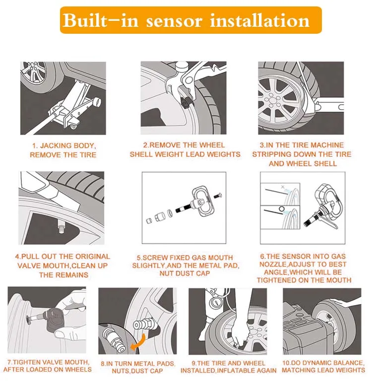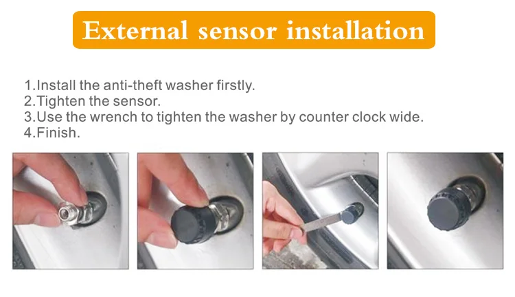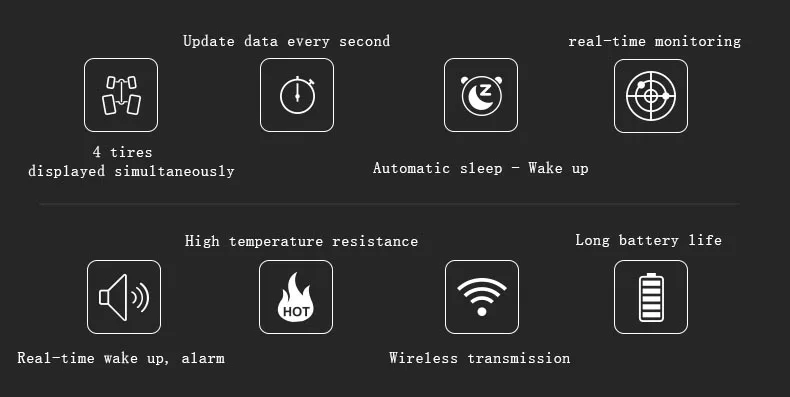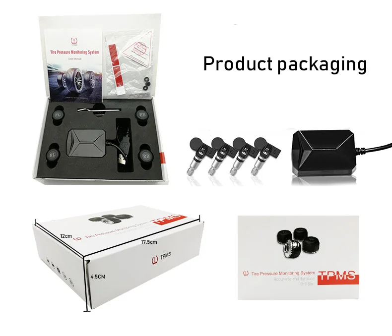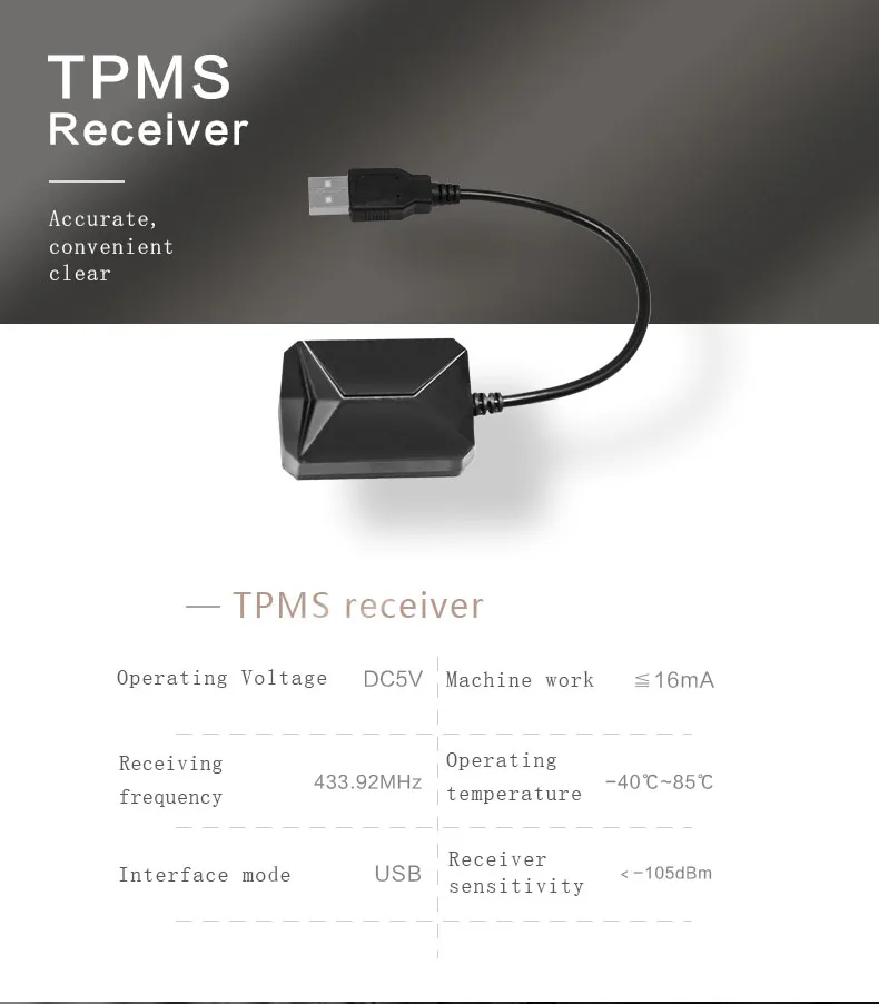 TPMS для Android OS автомобильный dvd-плеер -Приемник TPMS может быть подключен к автомобильный dvd-плеер на основе Android через порт USB -Отображение данных о давлении и температуре шин на автомобильном DVD-экране Android -Звуковая сигнализация с помощью автомобильных динамиков и экранной сигнализации, когда происходит аномалия -Предотвращает взрыв шин, продлевает срок службы шин и экономит топливо -Датчик автоматически просыпается при запуске шины -Быстрое обновление данных о давлении и температуре шин на приложение Android TPMS -Автоматический сон для экономии энергии после парковки 6 защиты для безопасного вождения ① Сигнализация высокого давления ② Сигнализация низкого давления ③ Сигнализация утечки воздуха ④ Высокотемпературная сигнализация ⑤ Сигнализация низкого заряда батареи ⑥ Датчики отключение сигнализации Рабочая Напряжение: 2,1 V ~ 3,5 V Диапазон измерения температуры: -30 °C ~ + 85 °C Рабочая температура: -30 °C ~ + 60 °C Диапазон измерения давления: 0 ~ 8 бар (0 ~ 116 psi) Давление Точность: ± 1,5 фунтов/кв. дюйм (± 0.1bar) Частота передачи: 433,92 МГц