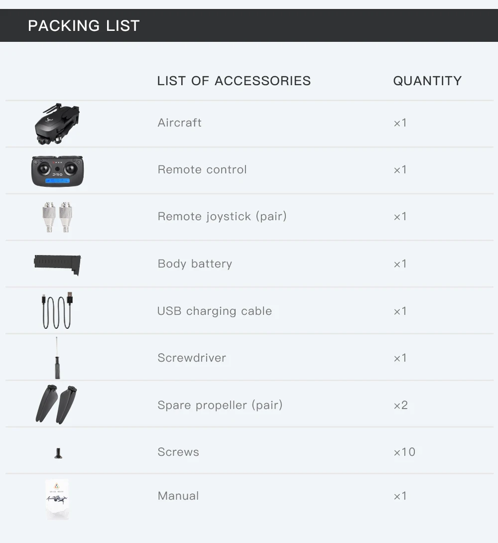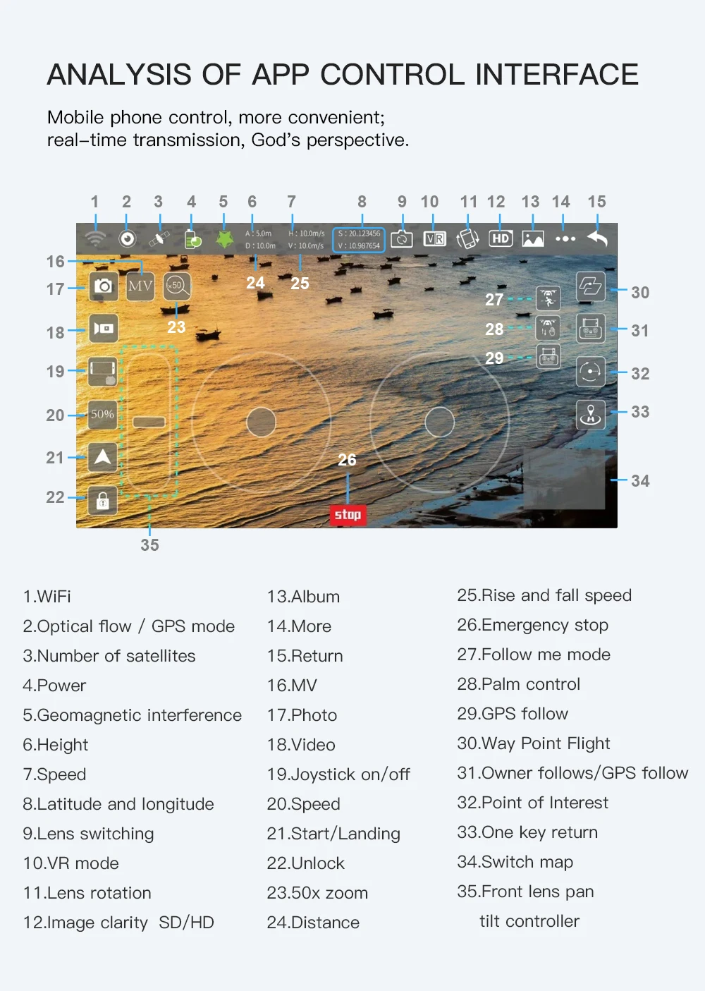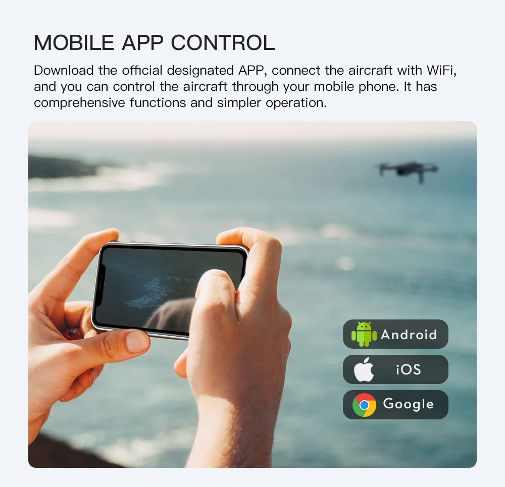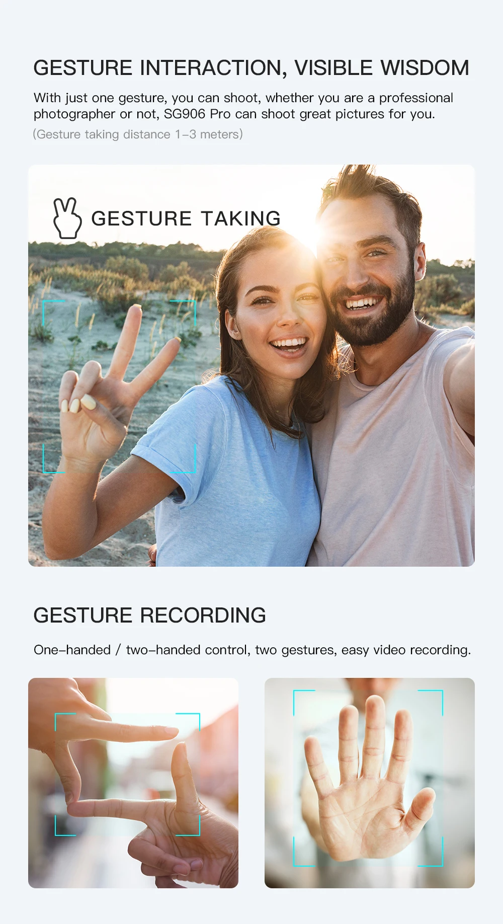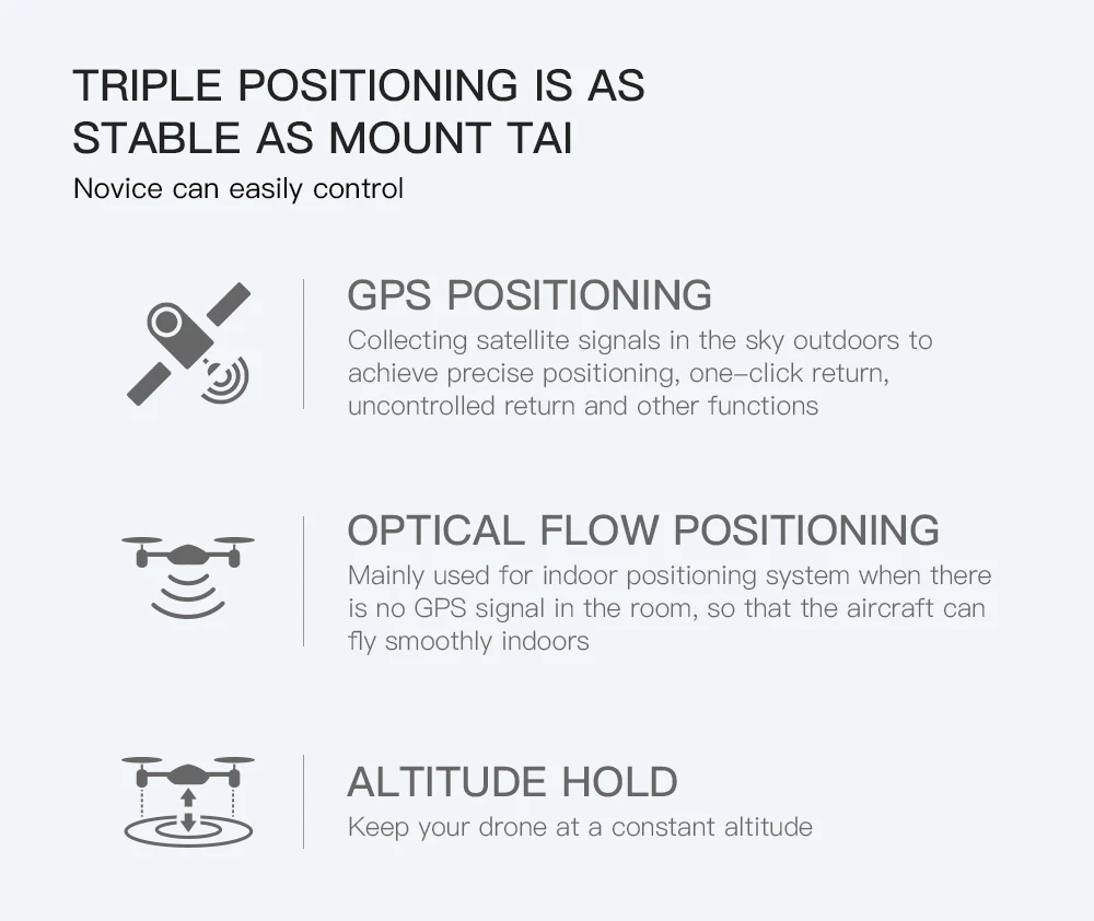 Складной, запуск одной кнопкой, посадка одной кнопкой, обслуживание высоты, постоянный оптический поток, две камеры, подключение Wi-Fi, управление приложением, фотографии жестов, запись жестов, наблюдение за умным IPP, следуйте режиму me, управление ладонями (слева направо), полет в пути, точка заинтересованности, контроль скорости, передача в реальном времени, MV изображение и видео обмен, GPS возврат домой.