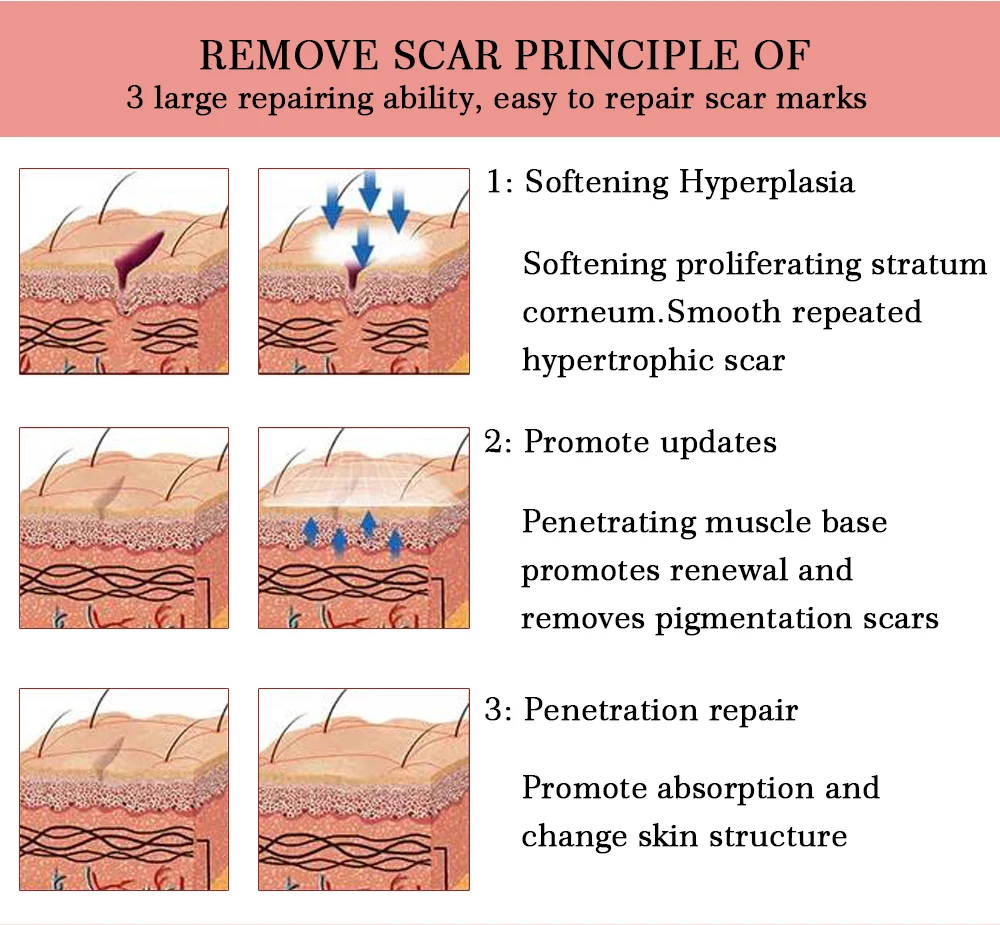 Принцип удаления рубцов 3 Большие ремонтные способности, легко восстанавливают шрам 1: смягчение гиперплазии Смягчающий пролиферационный роговой слой. Гладкий повторный гипертрофический шрам 2: продвижение обновлений Проникающая мышечная основа способствует обновлению и Удаляет пигментные шрамы 3: ремонт проникновения Способствует поглощению и изменению структуры кожи