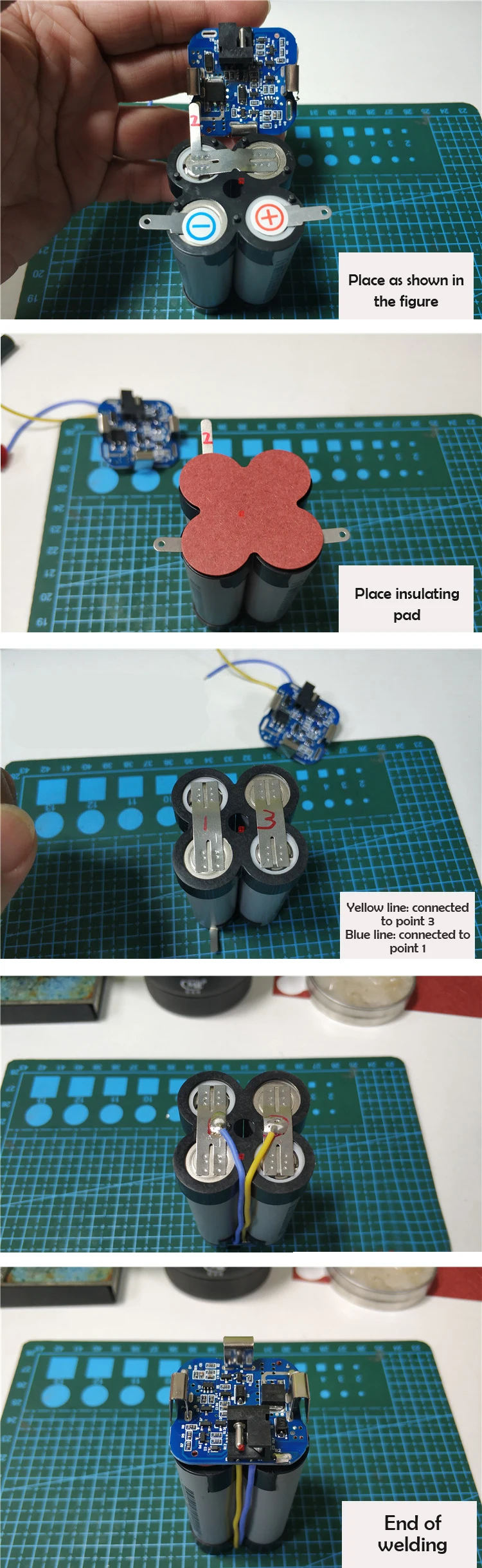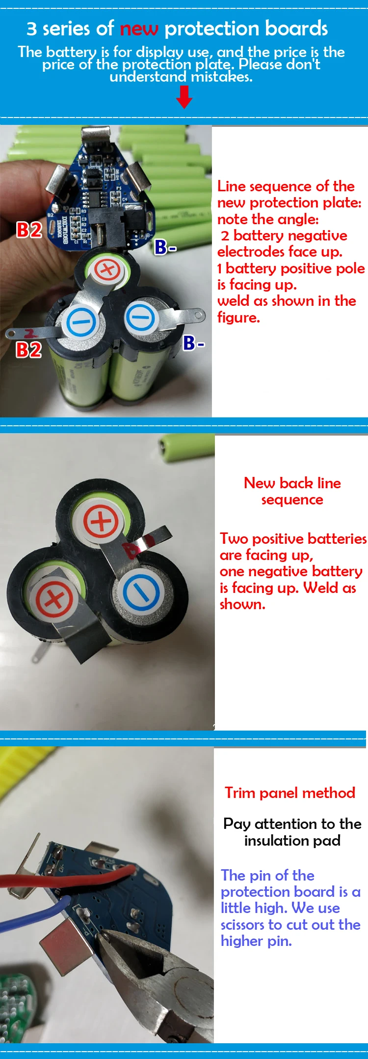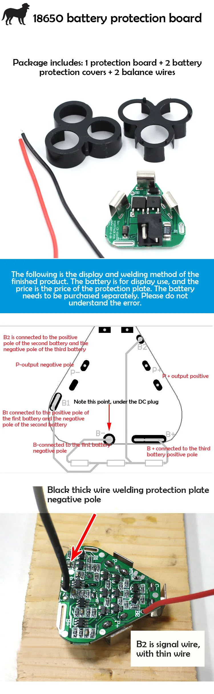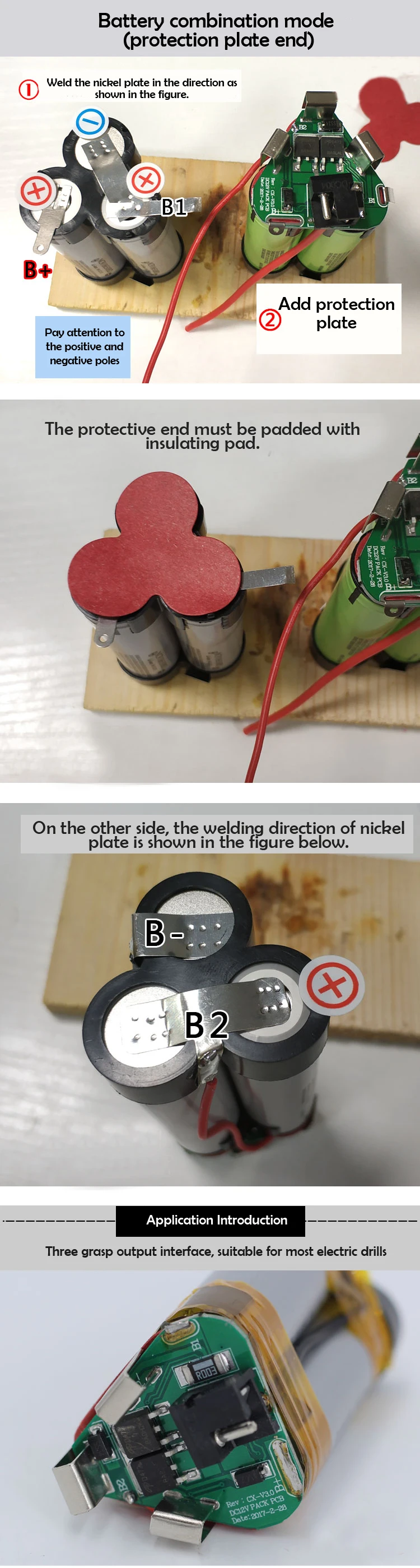 Устранение неполадок и решения Феномен неисправности Устранение неисправностей и причин Обработка и гарантия Не удается разрядить ток Сначала Подключите зарядное устройство для зарядки. Измерьте напряжение четырех батарей соответственно. Если напряжение одного аккумулятора ниже, чем 2,7 V, резервная плата начнет защита от разрядки. Сопоставимые каждому товару, аккумулятор, не смешивать хороший аккумулятор и поврежденные батареи, пожалуйста, баланса батареи в пределах одной и той же напряжением и сварите его (например, 3,7 V). Без разряда Измерьте напряжение четырех батарей. Если один аккумулятор превышает 4,23 в, плата защиты начнет защиту от перегрузки. Подходит для каждой батареи, не смешивайте хороший аккумулятор и поврежденную батарею. Сбой зарядки/перегрузки B - (0 В), B1 (3,7 в), B2 (7,4 В), B3 (11,1 В), B + (14,8 в) неправильно подключены. Перемотайте или замените доску. Искусственный дефект, если он не может быть использован, пожалуйста, купите еще раз. Перезарядка/сбой разрядки B - (0 В), B1 (3,7 в), B2 (7,4 В), B3 (11,1 В), B + (14,8 в) неправильно подключены. Перемотайте или замените доску. Искусственный дефект, если он не может быть использован, пожалуйста, купите еще раз. Защита от разрядки Проверьте, превышает ли пусковая мощность нагрузки ток защиты от перегрузки по току защитной платы. Замените защитную пластину с большим током, который находится за пределами рабочего диапазона. Электростатический пробой Когда питание не включено, измерьте уровень G, D и S трубки MOS, а сопротивление вперед и обратное сопротивление любых двух контактов составляет 0 Ω. Удалите и замените трубку MOS самостоятельно Примечание: Убедитесь, что каждый продукт был протестирован и отправлен профессиональным тестером платы защиты, потому что плата защиты может быть повреждена из-за статического электричества и тока при сборке батарей, И это нормально иметь дефектные продукты в адаптации.