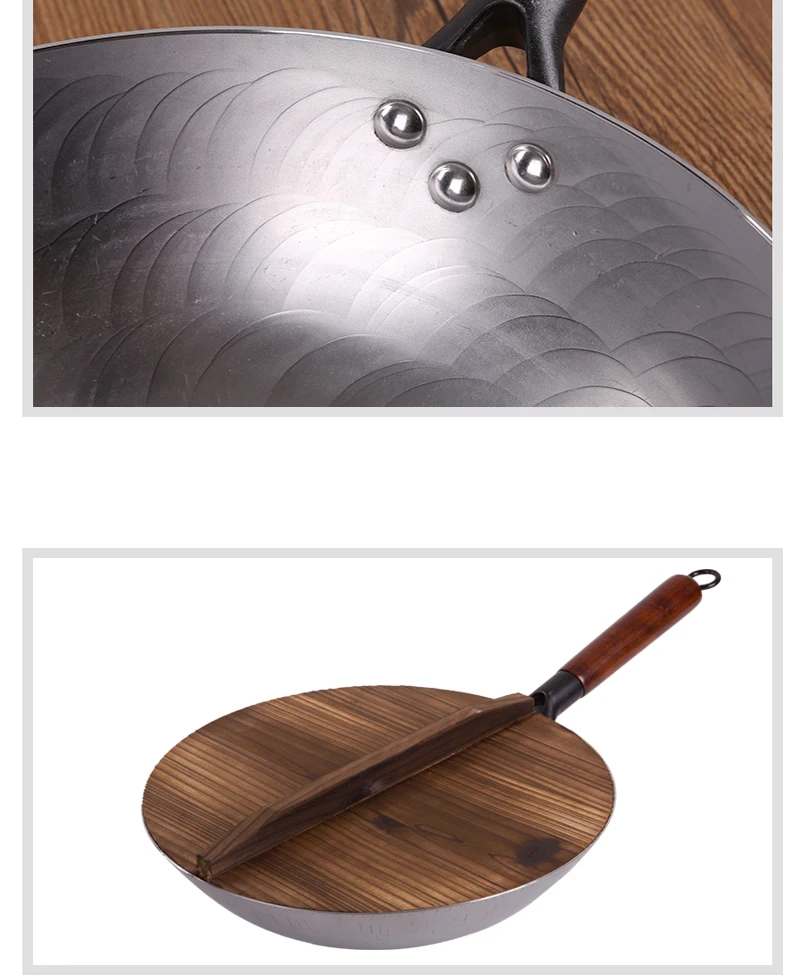 Традиционная ручная работа, 100% Железный ВОК, утолщенный, не покрытый круглым дном, сковорода, ВОК, готовка, большой кастрюль, деревянная ручка, крышка