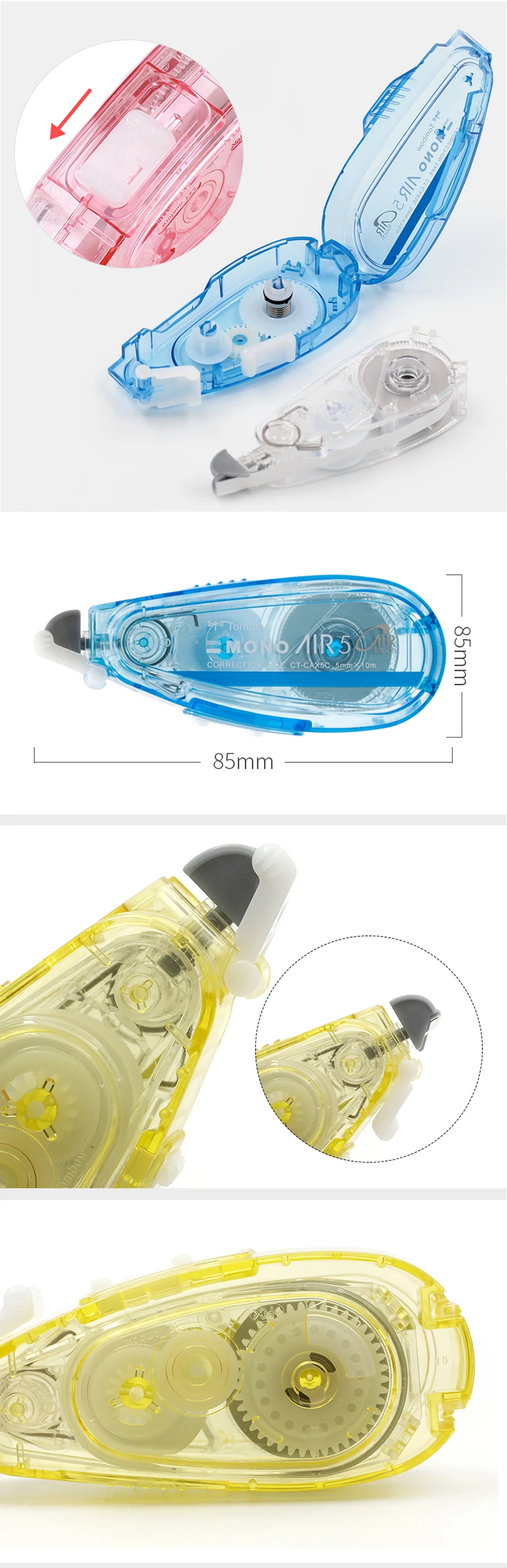 Бренд: TOMBOW Название продукта: Корректирующая лента серии AIR Модель: CT-CAX5C6 пополнение: CT-CAR5C Размер: 5 мм * 10 м Материал: смола особенности: бесшумный дизайн. Бесшумная конструкция уменьшает звук передачи прокатки во время использования. Его можно легко использовать в тихих местах.