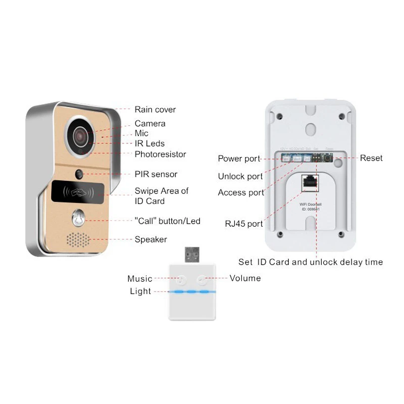 1 дверной звонок samrt может быть подключен через wifi или cat5e LAN кабель. Когда Посетитель нажимает кнопку на дверной звонок, ваше умное Устройство взаимодействует с дверным звонком. 2 через видео в реальном времени и полный дуплексный разговор. 3. Сделайте фото скриншотов, которые сохраняют непосредственно на смарт-устройстве и записывайте видео, которые сохраняют непосредственно на microSD карту дверного звонка. 4 активирует ваш внутренний chime с предустановленными мелодиями и регулятором громкости дополнительные функции включают разблокировку и блокировку ворот или двери через умное устройство во время вызова, А также доступ к rfid-картам для 5 пользователей-гостей и других пользователей.