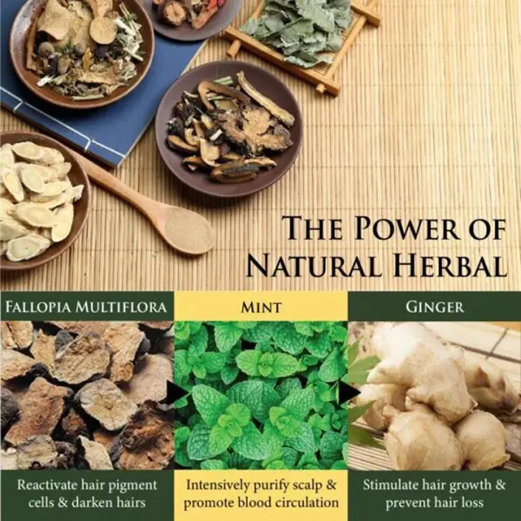 Contains herbs like fallopia multiflora to reactivate hair pigment cells Melanocytes, and ginger with natural anti-inflammatory and antiseptic properties which keep scalp healthy, while mint for intensive purifying of scalp.
