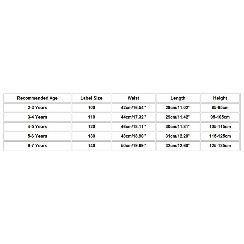 Рекомендуемый возраст Размер этикетки Талия Длина Высота От 2 до 3 лет 100 42 см/16,54'' 28 см/11,02'' 85-95 см От 3 до 4 лет 110 44 см/17,32'' 29 см/11,42'' 95-105 см От 4 до 5 лет 120 46 см/18,11'' 30 см/11,81'' 105-115 см От 5 до 6 лет 130 48 см/18,90'' 31 см/12,20'' 115-125 см От 6 до 7 лет 140 50 см/19,69'' 32 см/12,60'' 125-135 см
