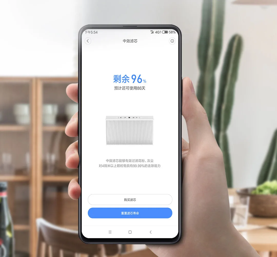 Со временем производительность фильтра снизится до сбоя. Если он не заменяется в течение длительного времени, он не только не сможет фильтровать вредные вещества, но также вызовет вторичное загрязнение. Мы рекомендуем, чтобы цикл замены фильтра средней эффективности был около 3 месяцев. Мобильное приложение Mijia также рассчитает время замены на основе использования. Вы можете проверить потребление фильтра в любое время.