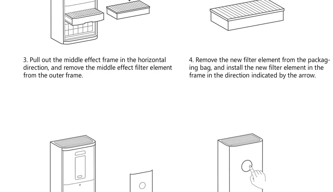 1. Вытяните переднюю панель наружу из паз с обеих сторон фюзеляжа и снимите ее. 2. Удерживайте кнопку на нижней крышке фильтра и вытяните ее, чтобы удалить нижнюю крышку фильтра. 3. Вытяните рамку среднего эффекта в горизонтальном направлении и удалите фильтрующий элемент среднего эффекта из внешней рамки. 4. Извлеките Новый фильтрующий элемент из упаковочного пакета и установите Новый фильтрующий элемент в рамке в направлении, указанном стрелкой. 5. Вставьте внешнюю рамку в слот для карты в горизонтальном направлении, а затем Замените нижнюю крышку фильтра и переднюю панель. 6. Удерживайте клавишу дисплея в течение 3 секунд. После получения запроса следуйте инструкциям на экране, чтобы повторно записать срок службы фильтра.