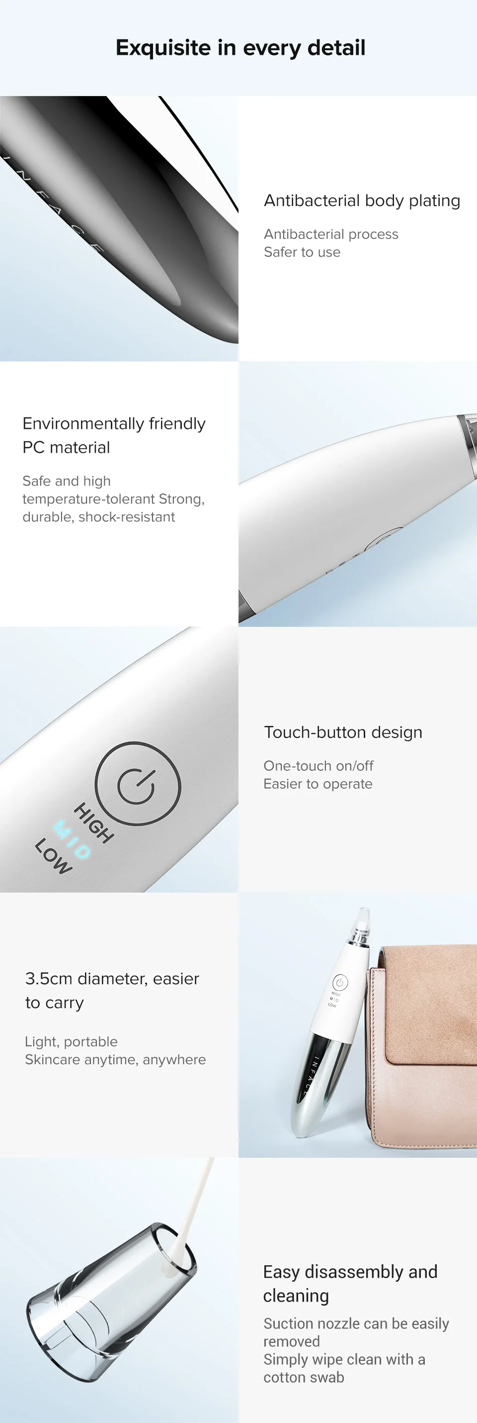 Средство для удаления черных точек inFace имеет выпуклый кривой 30 °, который более плотно прилегает к коже лица. Он не только усиливает силу всасывания, но и не легко царапает кожу.