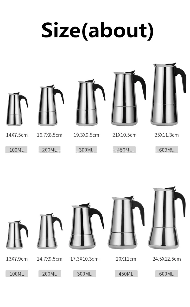 Цвета: серебристый Материал: нержавеющая сталь 304 Вес брутто (около) : 260 г/320 г/410 г/550 г Емкость: 100 мл/200 мл/300 мл/450 мл Посылка включает в себя: 1 х горшок