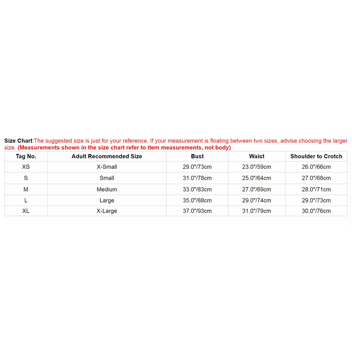 Номер бирки Рекомендуемый размер для взрослых Бюст Талия От плеча до паха XS X-Small 29,0 "/73 см 23,0 "/59 см 26,0 "/66 см S Маленький 31,0 "/78 см 25,0 "/64 см 27,0 "/68 см М Средний 33,0 "/83 см 27,0 "/69 см 28,0 "/71 см L Большой 35,0 "/88 см 29,0 "/74 см 29,0 "/73 см XL X-Large 37,0 "/93 см 31,0 "/79 см 30,0 "/76 см Полезные советы: Замеры делаются вручную, поэтому учитывайте небольшие погрешности. Цвет на фото может немного отличаться от реального товара из-за особенностей цветопередачи различных мониторов.