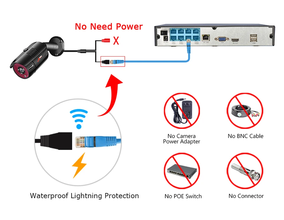 Эта система камер безопасности будет работать в кратчайшие сроки благодаря технологии Power-over-ethernet (PoE). Все, что требуется для подключения каждой вашей камеры безопасности к NVR, это один ethernet-кабель. Этот кабель обеспечивает как питание, так и передачу видео.