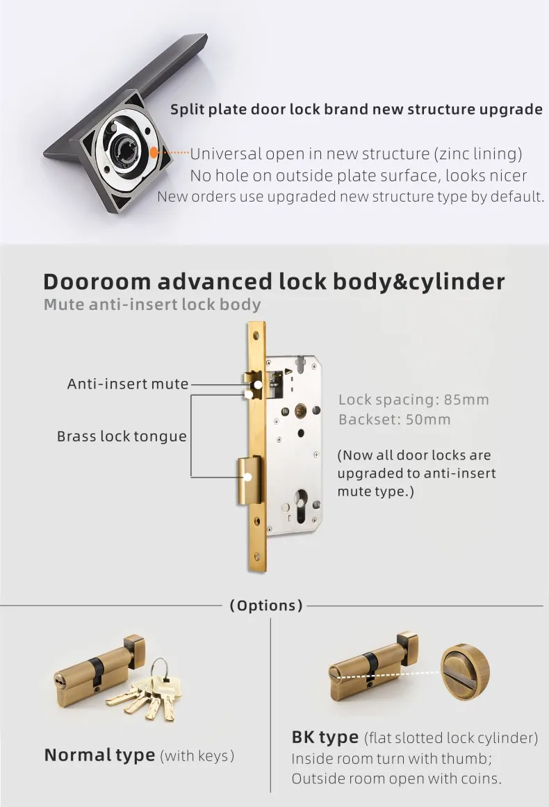 Ручка: латунь Пластина: цинковый сплав Цилиндра: цинковый сплав Клавиш: цинковый сплав Замок язык: цинковый сплав Корпус замка размер: Расстояние между замками: 85/72 мм Величина: 50/55 мм