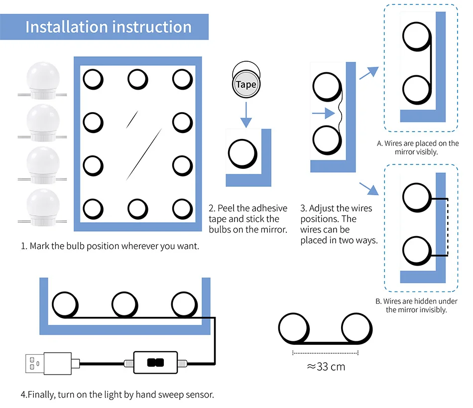 *The Max distance between two bulbs is about 33cm, which makes it fit most mirrors.