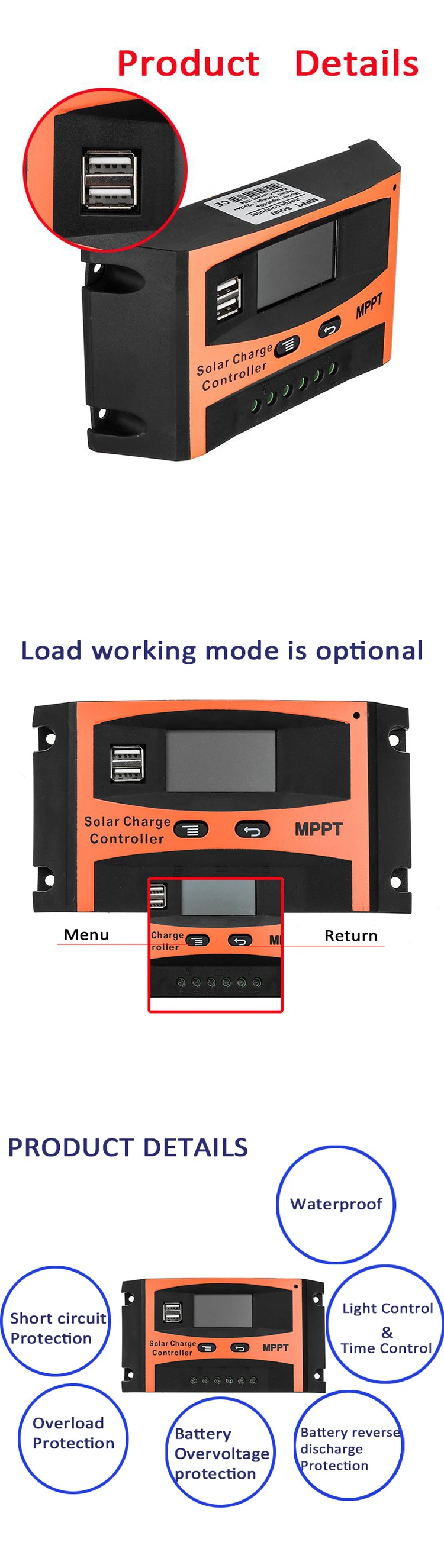 Особенности: Стабильная производительность: Встроенный промышленный микроконтроллер для стабильной работы в холодной, высокой температуре и влажной среде. Напряжение 12 В/24 В автоматически распознавается и интеллектуальна, что обеспечивает больше удобства для вашей жизни. Большой ЖК-экран: обеспечивает легкое и интуитивное управление. Двойной выход USB: легко подключается к телефону для быстрой и мощной зарядки вашего телефона. Комплексная защита: обеспечивает перезарядку, переразрядку, защиту от перегрузки и защиту от короткого замыкания и обратного подключения. Широкий диапазон нагрузки: легко наносится на различные типы уличных фонарей и оборудования для мониторинга. Широкий диапазон применения: солнечный зеленый светильник, солнечный светильник, рекламные щиты, Солнечные Инсектицидные Лампы, системы солнечной энергии, морские системы солнечной энергии, системы солнечной энергии и т. Д. Параметры: Цвет: черный + оранжевый Номинальный ток при зарядке: 30A 40A 50A 60A Номинальный ток нагрузки: 30A 40A 50A 60A Рабочее напряжение: 12 В/24 В Плавающее напряжение зарядки: 13,8 В/27,6 в (регулируется) Защита от пониженного напряжения: 10,7 В/21,4 в (регулируется) Спецификация контроллера зарядного устройства режим зарядки: 3 вида Рабочая температура: 35-60 °C Температура хранения: 40 °C -70 °C