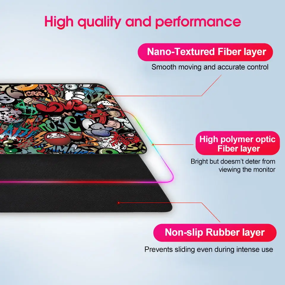 1: 【 большой и идеальный Размер 】: размер идеально подойдет Вашему рабочему столу и обеспечит идеальное пространство для движений. 2: 【 противоскользящее резиновое основание 】: супер светящееся волокно и мягкая ткань с нескользящей резиновой основой обеспечивают точное, точное управление мышью и стабильную стабильность на вашем столе. 3: 【 Ультра гладкая поверхность 】: разработан с тончайшим волоконным плетеным материалом, с микротекстурированной, гладкой поверхностью, точной навигацией и оптимизацией вашего игрового опыта. 4: 【 7 режимов освещения 】: супер светящееся волокно-Chroma настраиваемое освещение обеспечивает отличительный внешний вид, красный. Темно-синий, желтый. Зеленый, розовый, белый.