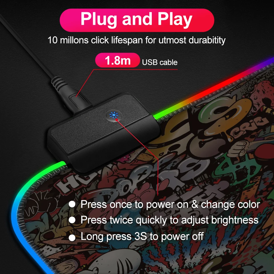 1: разработан геймером, отлично подходит для игр/работы в офисе 2: толщина = 4 мм 3: Материал: микротекстурированная поверхность ткани, нескользящая резиновая основа и сверхсветящееся волокно 4: Рейтинг: 5 в 120 мА 5: Цвет: красный, синий, зеленый, фиолетовый, голубой, желтый, белый
