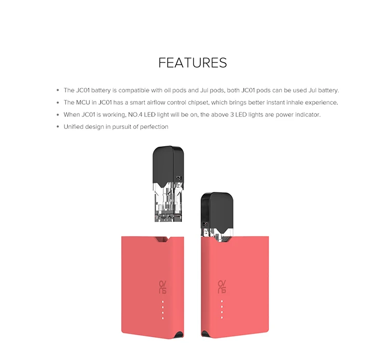Точки продажи продукта: 1. Аккумулятор JC01 совместим с жидкостными стручками и Jul pods, оба JC01 pods могут использоваться с аккумулятором Jul. 2. MCU в JC01 имеет умный чипсет управления потоком воздуха, который приносит более быстрый опыт вдыхания. 3. Когда JC01 работает, NO.4 будет включаться светодиодный светильник, выше 3 светодиодный светильник s являются индикатором питания. 4. Единый дизайн в погоне за совершенством Упаковочный лист: 1 x JC01 400 мА/ч, Батарея 1 x JC01 0,7 мл Pod 1.5ohm 1 x USB кабель 1 x Руководство пользователя 1 x Подарочная коробка