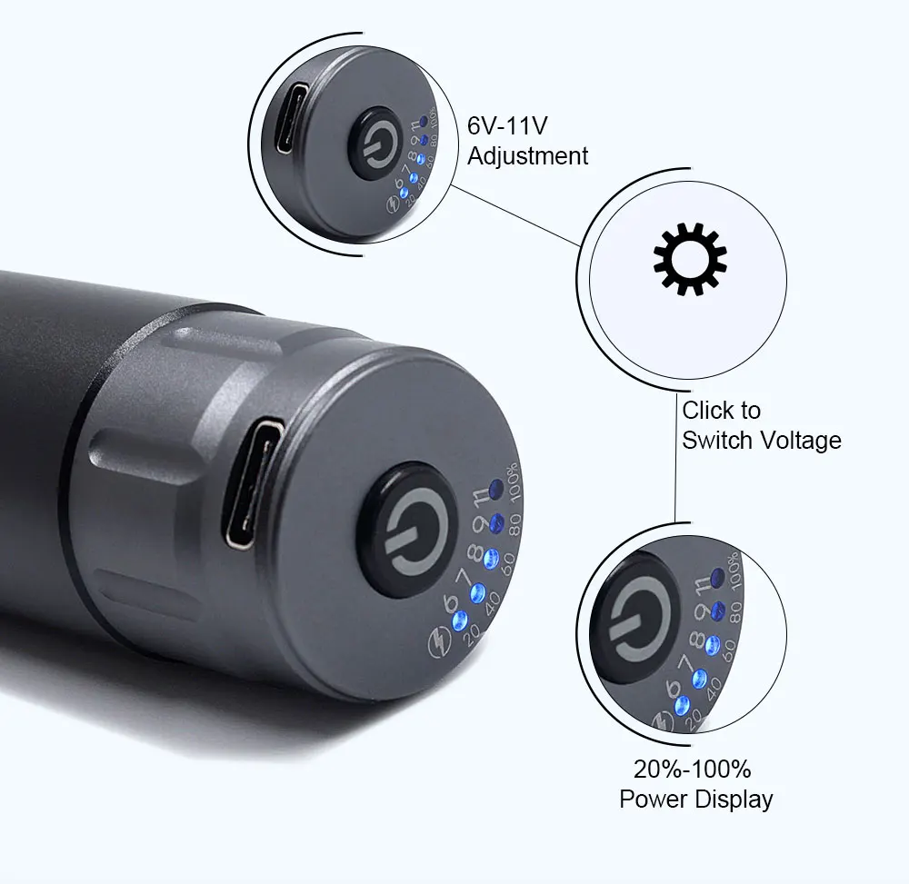 Товар: перезаряжаемый беспроводной источник питания для тату Выходное напряжение: Регулировка 6 7 8 9 11v Входное напряжение: DC5V/1A Режим зарядки: быстрая зарядка type-c Подключение: RCA Емкость аккумулятора: 1200 мАч Размер: 27.5x78мм Материал: алюминий Время зарядки: 3 часа Время работы: 5-8 часов Подключение: интерфейс RCA Вес нетто: 57 г Характеристика: 1,5 шестерни регулировки 2. Защита от короткого замыкания на выходе, 3. Дисплей питания 4. Маленький, в любое время и в любом месте 5. Двойная входная защита зарядки Примечание: Эта беспроводная Татуировка используется для роторной машины, а не для катушки тату-машины