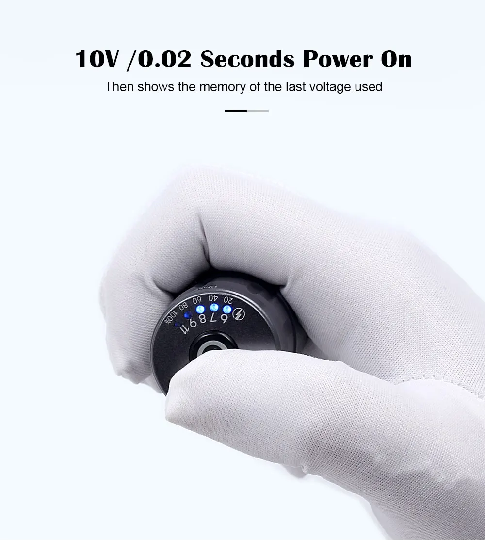 1 、 Пресс и удерживайте кнопку питания в течение 2 секунд, чтобы включить без пусковое устройство функции постоянного напряжения, быстро дважды нажмите кнопку питания включается в 10V начального напряжения в 0,2 s, затем загрузите до последнего рабочего напряжения памяти. 2. Нажмите кнопку питания для регулировки напряжения 6 7 8 9 11 В. 3. Он будет смещаться, чтобы отобразить емкость аккумулятора без работы в течение 2 с, и светильник индикатора находится в состоянии дыхания, пять индикаторов составляют 20%-100% мощности, нажмите кнопку возврата к дисплею напряжения. 4. Светодиодный светильник мигает во время зарядки, прекратите мигать при полной зарядке. 5 、 Пакет емкость составляет 1200 мАч, 3,5 часов, чтобы быть полностью заряженным при температуре выше 1A зарядное устройство, около 8 часов время работы при 8V. 6. Этот пакет предназначен только для роторных машин, но катушки машины. 7. Не используйте этот пакет во время зарядки. Примечание: Пожалуйста, подключите зарядное устройство для активации при выключении.