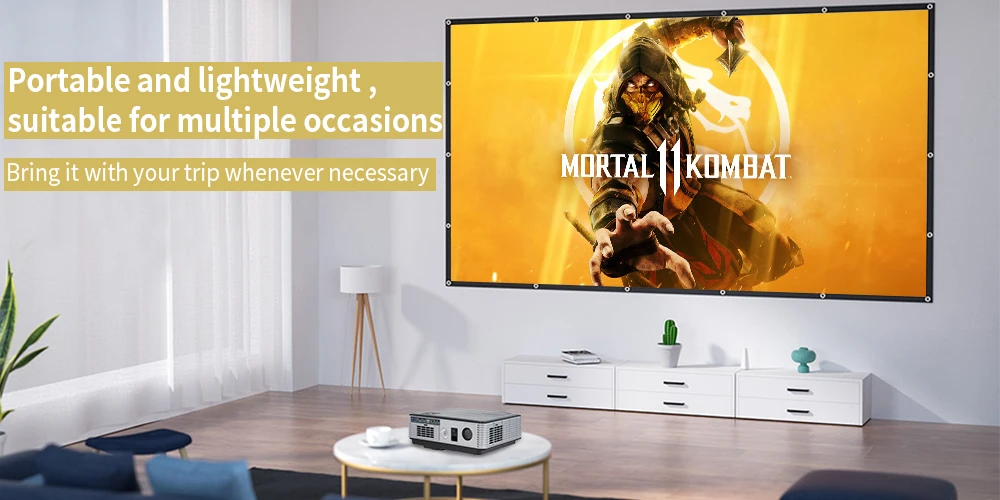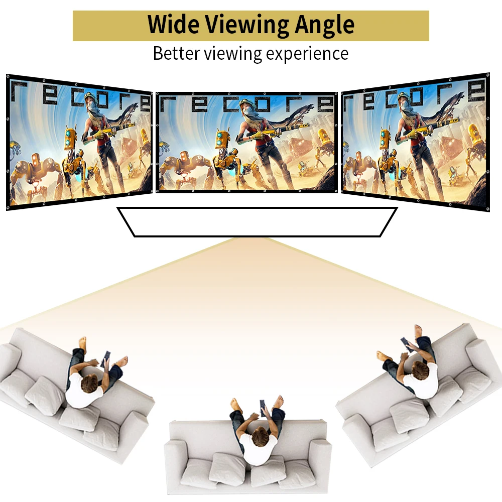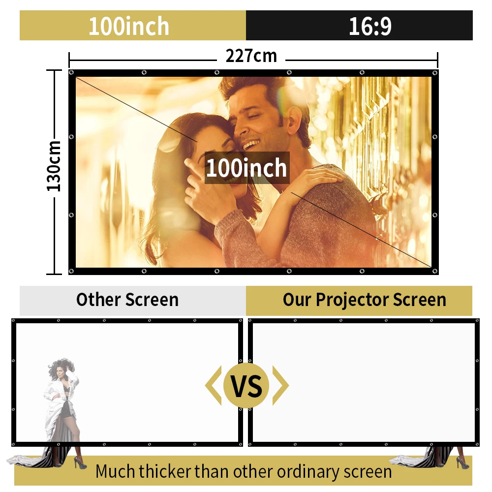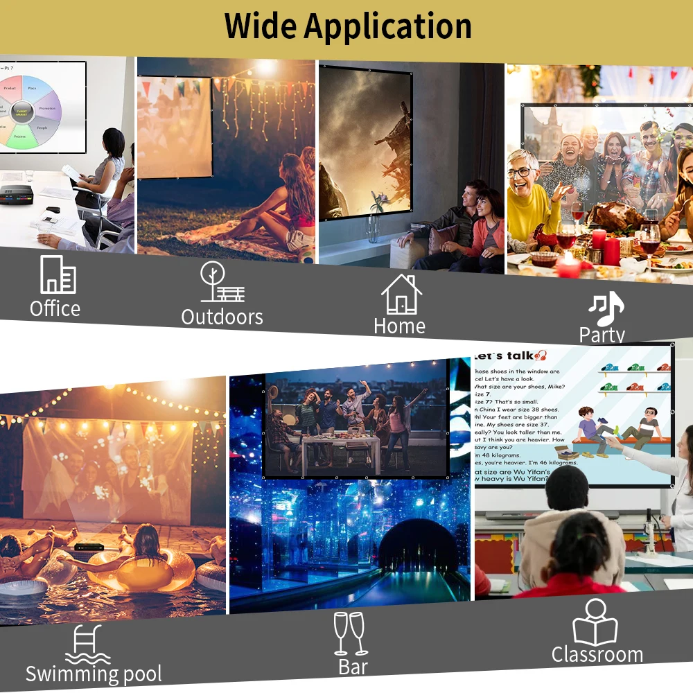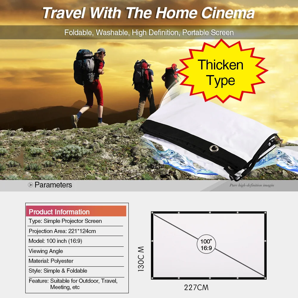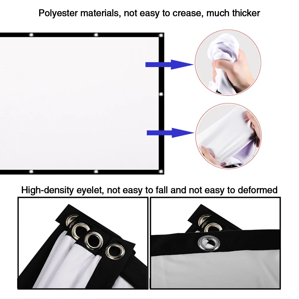Складной, моющийся, HD портативный С небольшими антипригарными крючками, легко и удобно устанавливать Thicken сгущенное шифрование, низкая светопроницаемость, истинный HD дисплей Высококачественная полиэфирная ткань, устойчивая к морщинкам и прочная, гладкая, как шелк Подвесные отверстия высокой плотности Подходит для домашнего кинотеатра, кемпинга на открытом воздухе, фильмов на открытом воздухе, встреч и других мероприятий