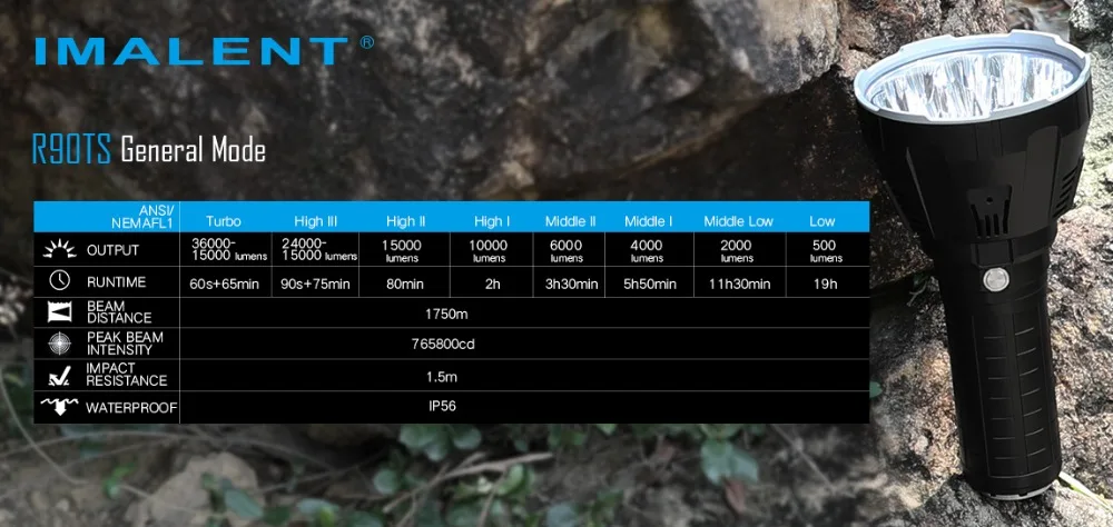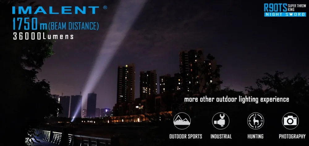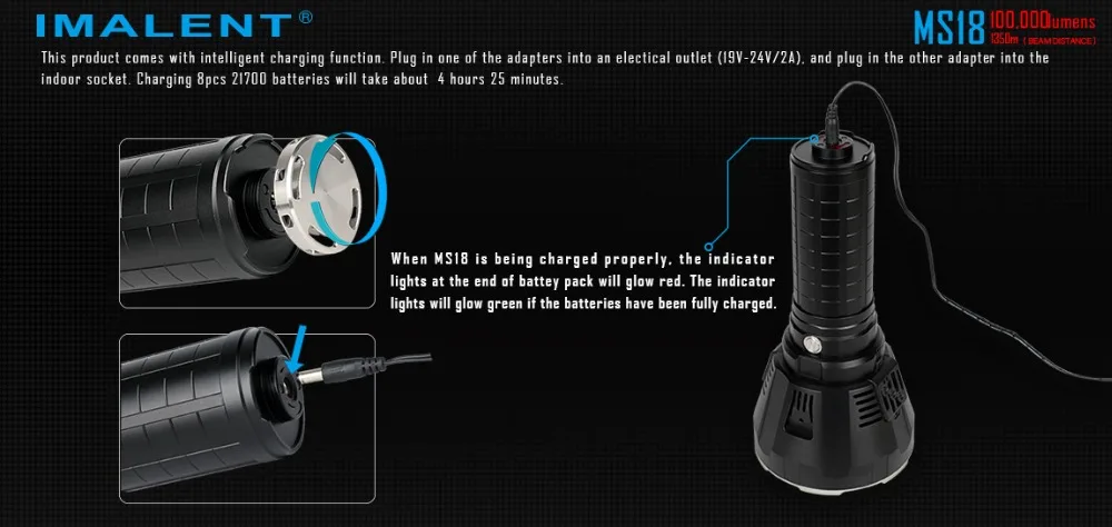 IMALENT MS18 фонарик + R90TS световая головка (2 головки + 1 корпус батареи) Характеристики MS18: Он использует 18 единиц американского CREE XHP70 XHP70 2-го светодиода с сроком службы до 50000 часов и максимальной мощностью до 100000 люменов. Интеллектуальная схема самопроверки безопасности интегрированная, удобная, быстрая и безопасная. Восемь уровней, которые могут быть изменены быстро и мгновенно турбо. Встроенный индикатор переключателя, легко найти в темноте Размер: 265 мм (длина) * 129 мм (диаметр головки) * 59 мм (диаметр корпуса) Вес нетто: 1900 г (батарея входит в комплект) Высокая эффективность цепи постоянного тока будет держать яркость постоянной Интегрированный модуль теплового контроля автоматически регулирует выходную яркость и продолжает удобно использовать его. Сочетание сверхпрозрачного закаленного минерального и антибликового алюминиевого покрытия стеклянного отражателя OP Корпус из алюминиевого сплава авиационного класса, износостойкий Тип III жесткая анодированная обработка поверхности IPX-5 водонепроницаемый стандарт R90TS: Особенности: Он использует 18 американских светодиодов HI CREE XHP35, с сроком службы до 50 000 часов и максимальной выходной мощностью до 36000 люменов. Интеллектуальная схема самопроверки безопасности интегрированная, удобная, быстрая и безопасная. Восемь уровней, которые могут быть изменены быстро и мгновенно турбо. Встроенный индикатор переключателя, легко найти в темноте Размер: 265 мм (длина) * 129 мм (диаметр головки) * 59 мм (диаметр корпуса) Вес нетто: 1950 г (батарея входит в комплект) Высокая эффективность цепи постоянного тока будет держать яркость постоянной Интегрированный модуль теплового контроля автоматически регулирует выходную яркость и продолжает удобно использовать его. Сочетание сверхпрозрачного закаленного минерального и антибликового алюминиевого покрытия стеклянного отражателя OP Корпус из алюминиевого сплава авиационного класса, износостойкий Тип III жесткая анодированная обработка поверхности Водонепроницаемый стандарт IP56 Комплектация: (батарея входит в комплект) 1 фонарик MS18 1 x световая головка R90TS Адаптер зарядного устройства-1 шт. 1 x ремешок 1 x Oring 1 x Руководство пользователя 1 x коробка для переноски