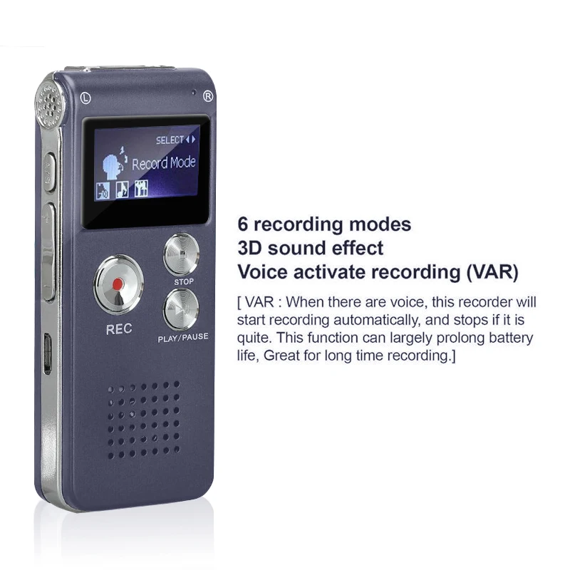Вместительная емкость 8 Гб: Диктофон может хранить около 199 голосовых документов форматов WAV и MP3. Поддерживает воспроизведение звука и функции удаления. Удерживайте одну кнопку хранения: просто нажмите кнопку, чтобы сохранить записанный голос. Регистратор также может автоматически сохранять голос при низком заряде батареи. Продолжительное время работы: со встроенной литиевой батареей этот рекордер поддерживает непрерывную запись 20h и время воспроизведения 7h. Перезаряжаемый usb-кабель: поставляется с usb-кабелем для удобной зарядки. Энергоэффективность и экологичность. Функция автоматического отключения: Диктофон автоматически выключается после неиспользования, чтобы сохранить питание для более длительного использования времени. Широкое применение: он может быть широко использован во время занятий, лекций, речи, интервью, встреч, групповых разговоров, записи подкастов. Идеально подходит для студентов, профессоров, преподавателей, бизнесменов, писателей, блогеров и т. д.