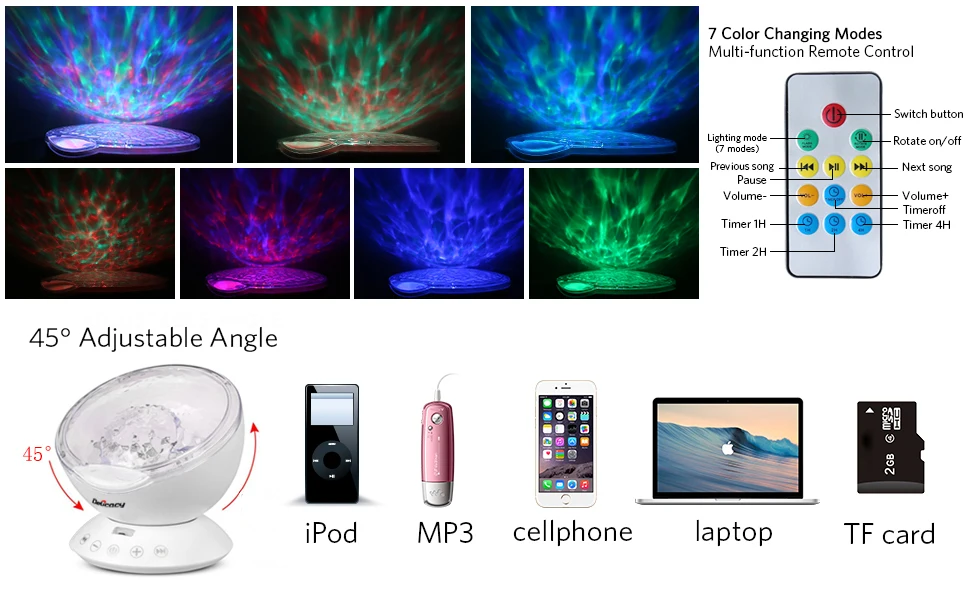 Ночной светильник ocean wave имеет встроенный динамик, поэтому вы можете вставить tf-карту для воспроизведения музыки или подключения к вашему iPod, MP3, ноутбуку, мобильный телефон и так далее с помощью прилагаемого 3,5 мм аудио-кабель. Наслаждайтесь любимой музыкой в приятной обстановке.