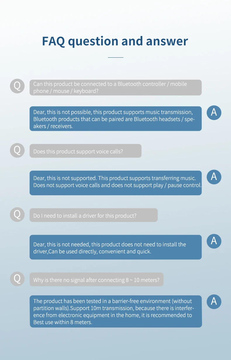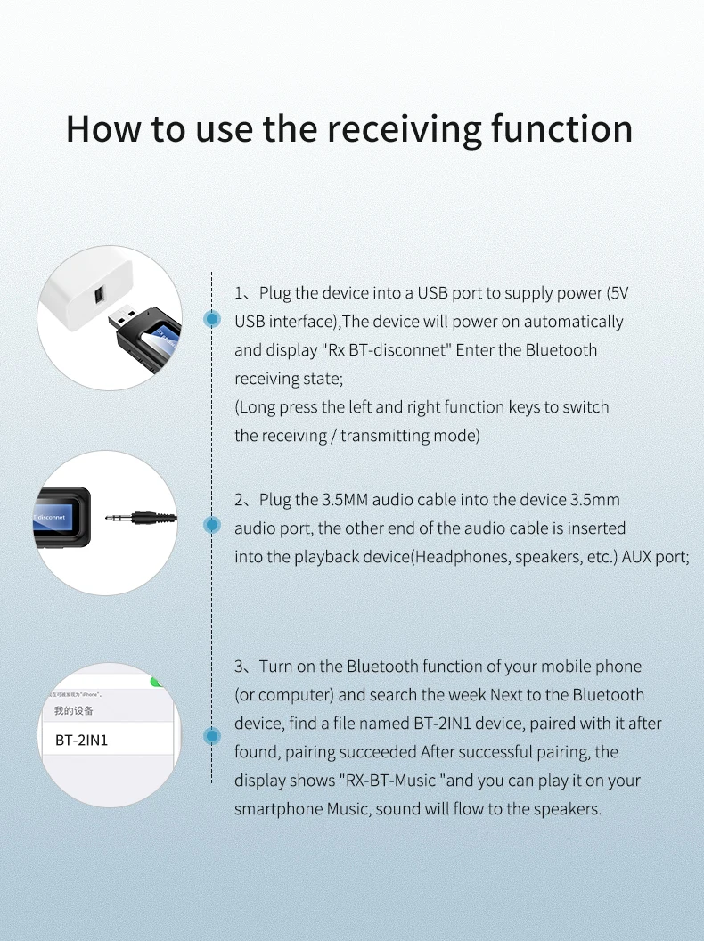 2 в 1 bluetooth-передатчик и приемник, как аудио-передатчик Bluetooth, специально разработан для аудиоустройств (например, MP3, MP4, TV и ПК и т. д.) без функции Bluetooth. Bluetooth передатчик можно подключать к аудиоустройствам без функции Bluetooth с помощью прилагаемого 3,5 мм аудио разъем, изменение этих аудио-устройств в аудио-устройства с поддержкой Bluetooth, И делает его совместимым с bluetooth-гарнитурой и динамиком; Как bluetooth-аудиоприемник, он специально разработан для автомобильной стереосистемы s и домашней аудиосистемы. Он может изменить традиционные автомобильные стереосистемы и домашние аудиосистемы на те, которые включены в Bluetooth, и легко соединяться со смартфонами с поддержкой Bluetooth, ноутбуком, планшетом и т. д. С помощью этого продукта вы можете наслаждаться музыкой с вашего телефона, ноутбука, планшета без хлопот с кабелей.