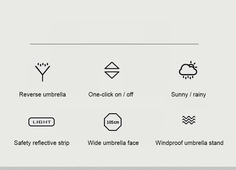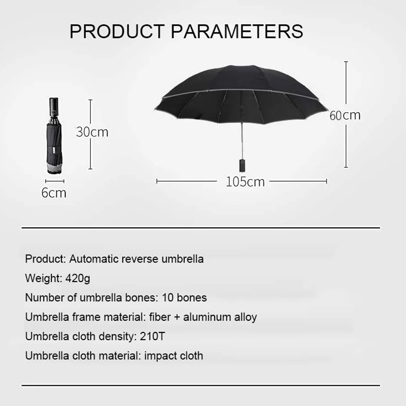Продукт: полностью автоматический деловой зонт Количество ребер: 10 ребер Материал подставки для зонта: стекловолокно + алюминиевый сплав Материал ткани зонта: ударопрочная ткань Размер: ширина зонта 105 см, длина 30 см после складывания Вес: около 420 г Особенности: большая площадь, сильная ветроустойчивость, Светоотражающая полоса на боковой части зонта