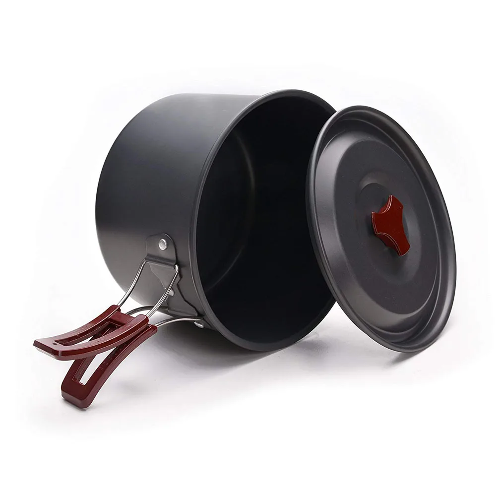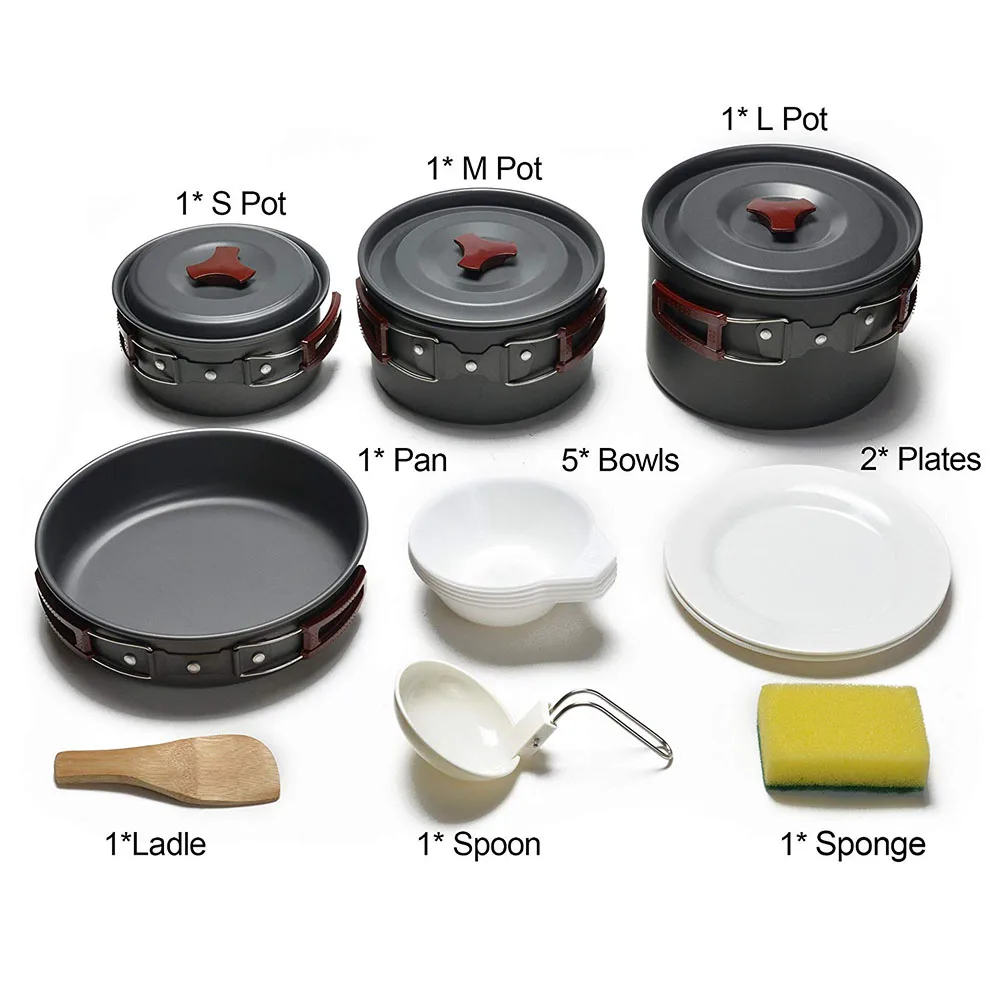 【Подходит для 3-5 человек 】: всего 14 в 1 Набор для кемпинга, включая 1 кастрюлю, 3 кастрюли, 2 тарелки, 5 чаш, 1 рисовая ложка, 1 ложка и 1 чистящий шар.