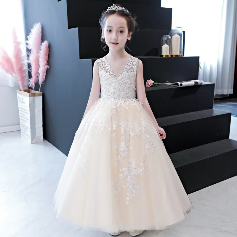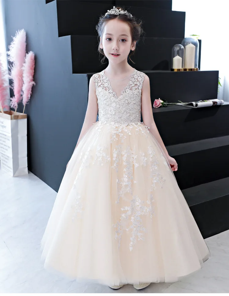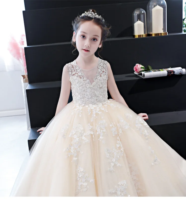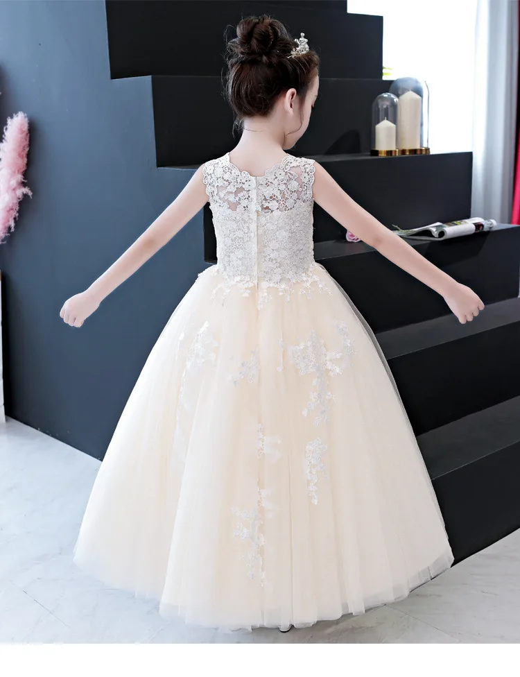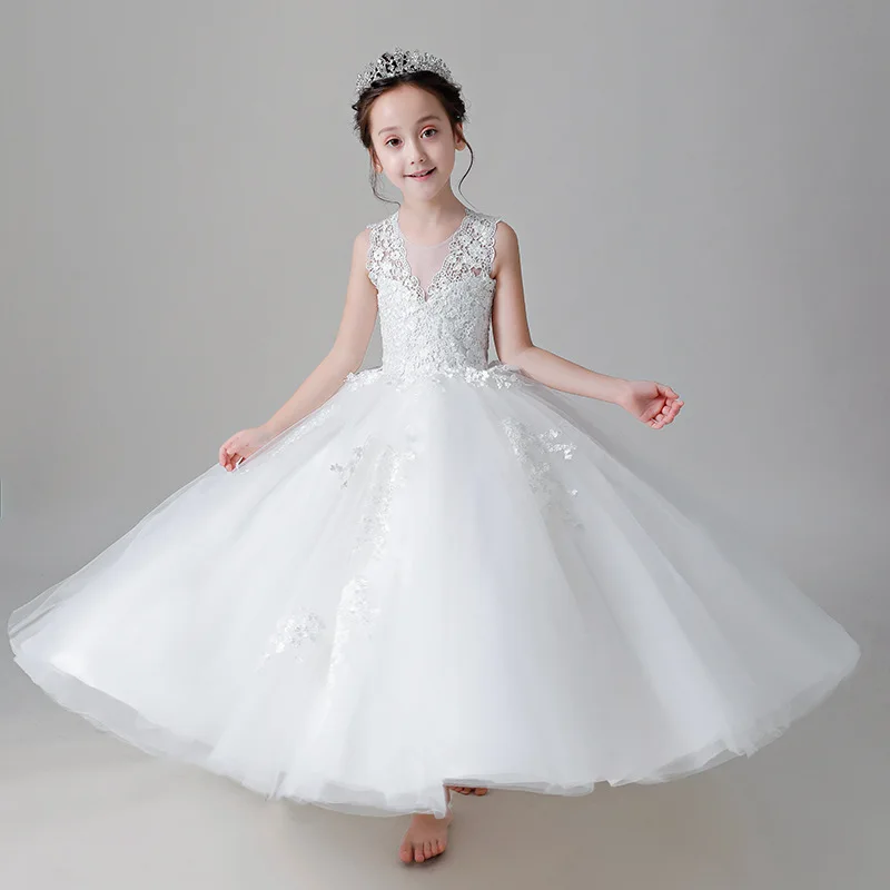 Белое элегантное платье для девочек Пышное Бальное Платье с фатиновой юбкой для маленьких девочек Детские платья принцессы с кружевной аппликацией для свадебной вечеринки