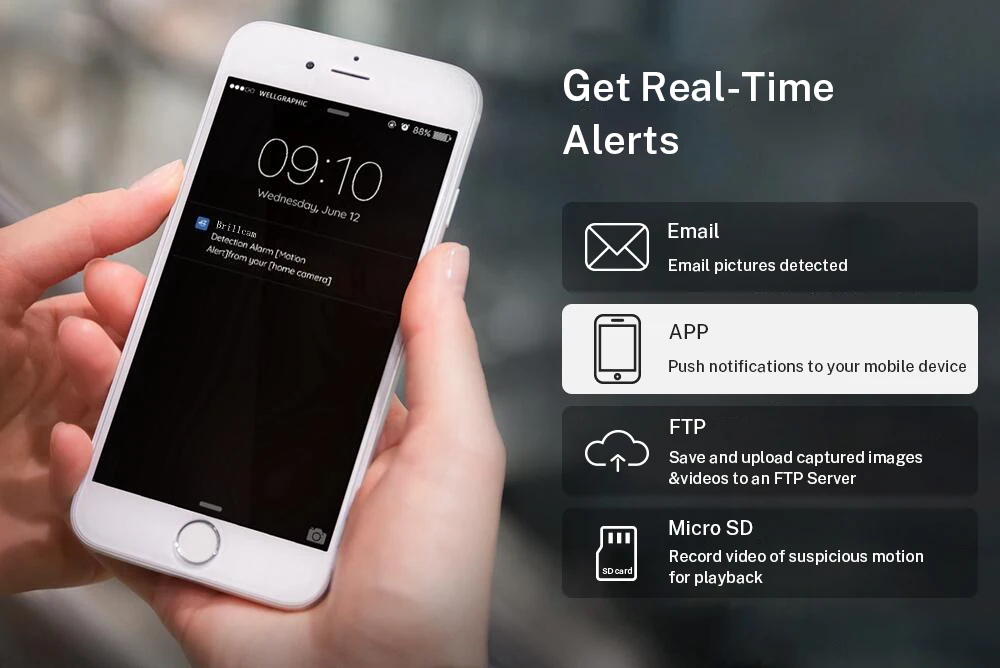 Получайте оповещения FTP/Email/App с любым подозрительным движением.