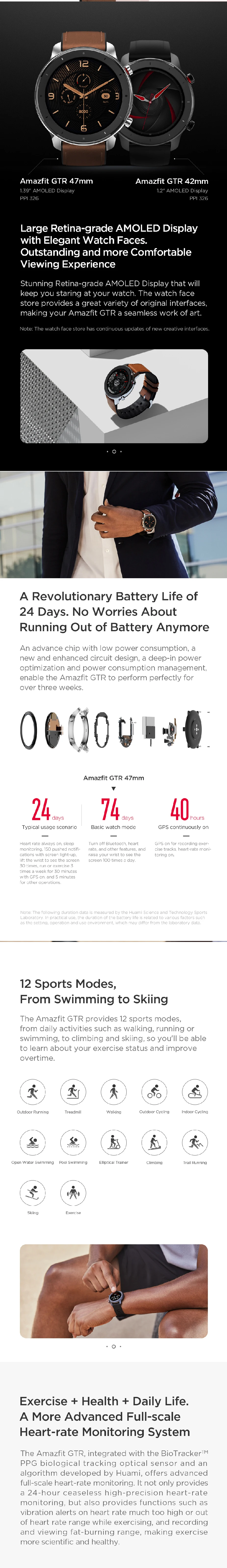 Умные часы Amazfit GTR 47 мм имеют классический вид традиционных часов, они идеально подходят для занятий спортом и бизнеса. Его наиболее заметной особенностью является Сверхдолгий Срок службы батареи, который до 24 дней для нормального использования, вы можете попрощаться с частой зарядкой. 12 спортивных режимов для отслеживания вашего здоровья в разном состоянии. Более 100 циферблатов часов на ваш выбор. ● Элегантный дизайн А. Стильный и гладкий дизайн придает ему традиционный вид часов; B. Большое разнообразие встроенных циферблатов для любого случая от спортивных до более стильных и традиционных. C. Флюоресцентные, кожаные + Силиконовые или силиконовые быстросъемные ремешки с превосходным внешним видом и защитой от пота. ● Высокое мастерство A. 1,39 дюймовый AMOLED дисплей с высоким разрешением 326PPI (retina level). Corning Gorilla glass & покрытие против отпечатков пальцев. Разрешение 454x454 B. Водонепроницаемость 5 АТМ для обеспечения нормального использования до 50 метров давления воды. Продолжительная Производительность: C. Срок службы батареи 24 дня, чтобы избежать частых зарядок и фокусироваться на повседневной деятельности. D. 28нм Ультра низкое энергопотребление Sony GPS чип, потребляя только 1/3 мощности по сравнению с аналогичными gps-чипами. E. Самостоятельно разработанная технология DualHeaTeck обеспечивает круглосуточное непрерывное измерение частоты сердечных сокращений более эффективно и с более низким энергопотреблением. ● Персональный тренажер A. 12 спортивных режимов: открытый/закрытый бег, прогулки, открытый/закрытый Велоспорт, эллиптический тренажер, бассейн/открытая вода плавание, альпинизм, бег по следам, катание на лыжах, упражнения. B. Встроенный GPS + ГЛОНАСС, который более точно, чем спутники, чтобы точно отслеживать ваши маршруты. ● Личный и медицинский помощник A. 24h непрерывный сердечный ритм, чтобы получить всестороннее представление о вашем сердечном ритме днем и ночью с зонами сердечного ритма + аномальное предупреждение о сердечном ритме. B. Мониторинг сна, чтобы лучше понять ваш сон. C. Умные уведомления, чтобы получить все важные обновления прямо на вашем запястье. D. Напоминания о сидячем положении уведомляют вас, когда вы слишком долго действовали. E. Прогноз погоды (от 5 до 7 дней) + напоминания о температуре Спецификация: Беспроводное подключение: Bluetooth 5,0/BLE Класс водонепроницаемости: 5 атм сертифицирован (глубина воды до 50 метров) Спутниковое позиционирование GNSS: GPS + GLONASS двойное Спутниковое позиционирование Сенсор s: PPG оптический датчик сердечного ритма, 6-осевой датчик ускорения, геомагнитный датчик, датчик давления воздуха, датчик окружающего освещения, датчик мощности
