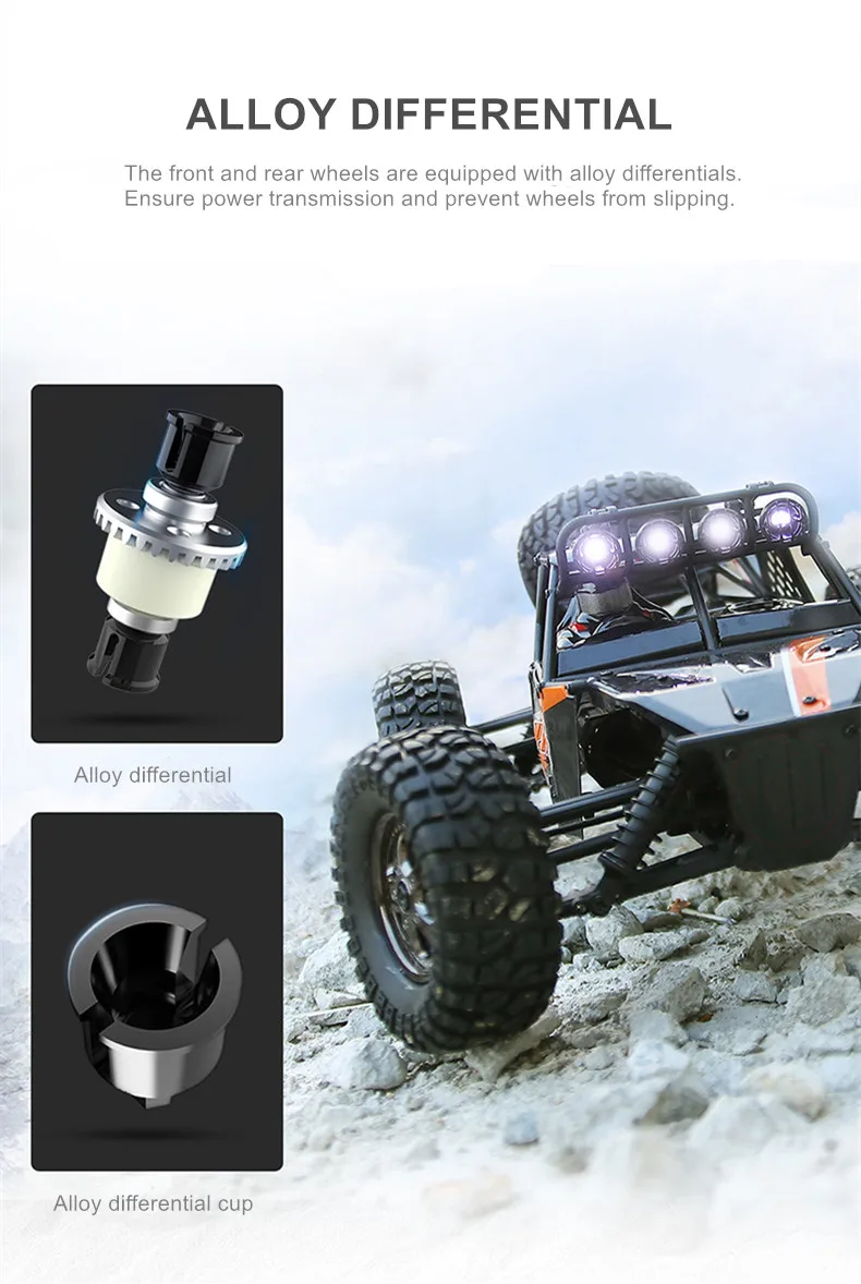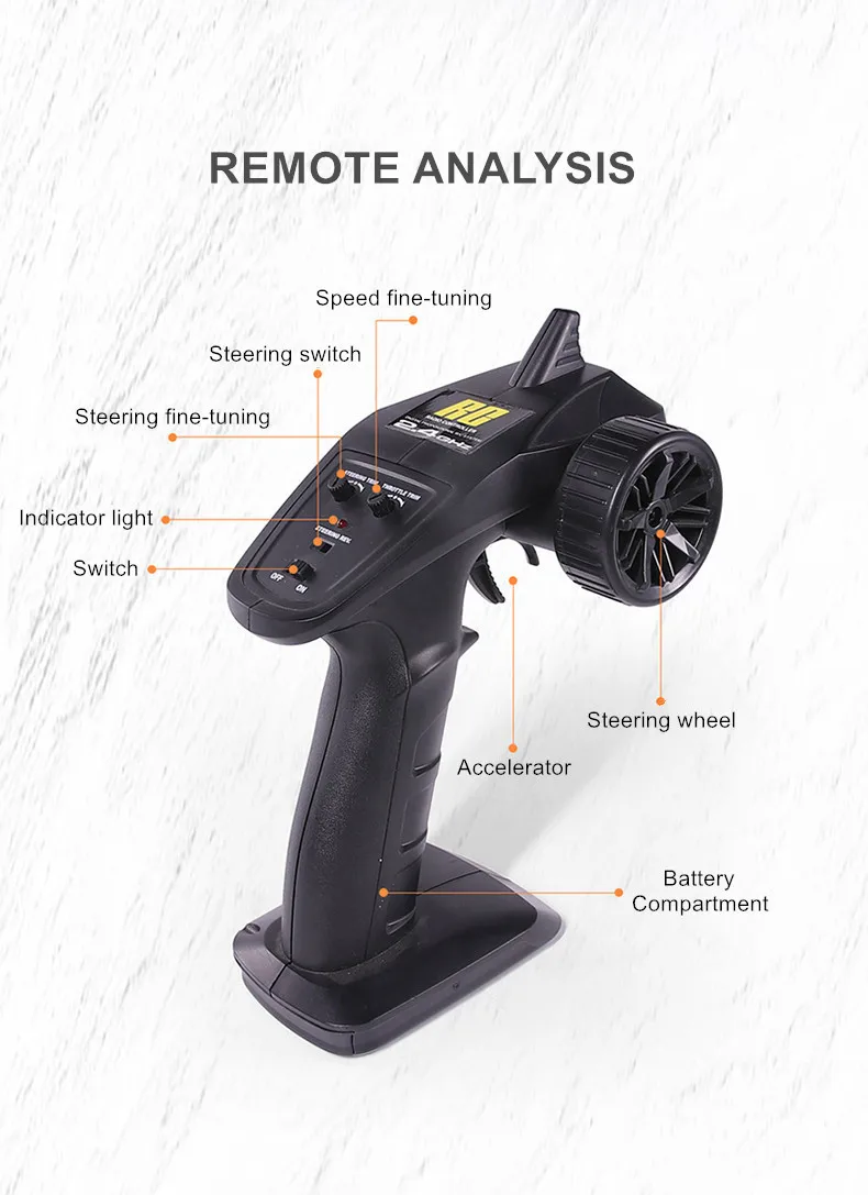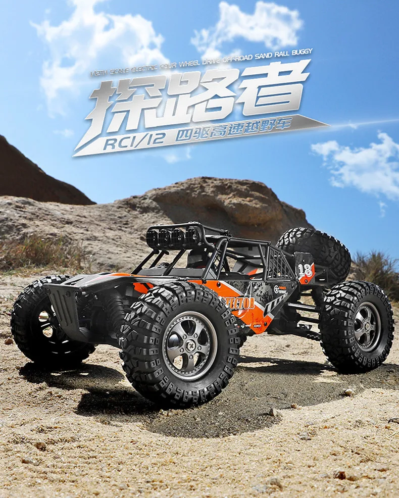 Название продукта: бездорожье Соотношение продукта: 1:12 Цвет изделия: оранжевый Размер продукта: 39,5x25,5x15,5 см (1 дюйм ≈ 2,4 см) Частота: 2,4 ГГц Двигатель: RC 390 Сильный магнитный Рулевая передача: 19g высокая скорость ESC: водонепроницаемый Скорость: 45 км/ч Удаленное Расстояние: > 100 м Срок службы: ≥ 20 минут Время зарядки: 360 минут Батарея Емкость: 3,7 V 1500 мА · ч (2 шт.) Пульт дистанционного управления батареи: 1,5 V "AA" x2 (к товару не прилагаются) Материал изделия: сплав, пластик, резина, электронные компоненты Конфигурация продукта: 4WD \ 2,4 GHz \ 19g высокоскоростная рулевая передача (2,2 кг крутящего момента) \ Водонепроницаемая встроенная защита ESC \ зарядка \ защита от захвата двигателя \ функция отключения низкого напряжения \ металлический дифференциальный \ Полный автомобильный подшипник \ независимая система подвески \ независимый амортизатор удара Характеристики продукта: высокая скорость, подъем, вперед, назад, поворот налево, поворот направо, светодиодный фонарь Посылка включает в себя: 1 x RC автомобиль 1 пульт дистанционного управления 2 батареи Зарядное устройство-1 шт. 1 х USB кабель 1 х Руководство