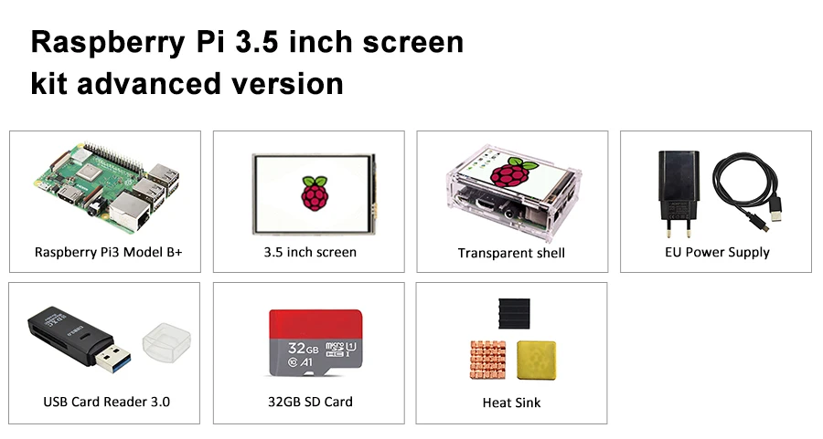 1.Raspberry Pi 3B plus 2.Raspberry Pi 3B plus 3.5 inch screen witht case 3.Raspberry Pi 3B plus heat sink 4.Raspberry Pi EU power adapter 5.32G TF card 6.Raspberry Pi USB Reader
