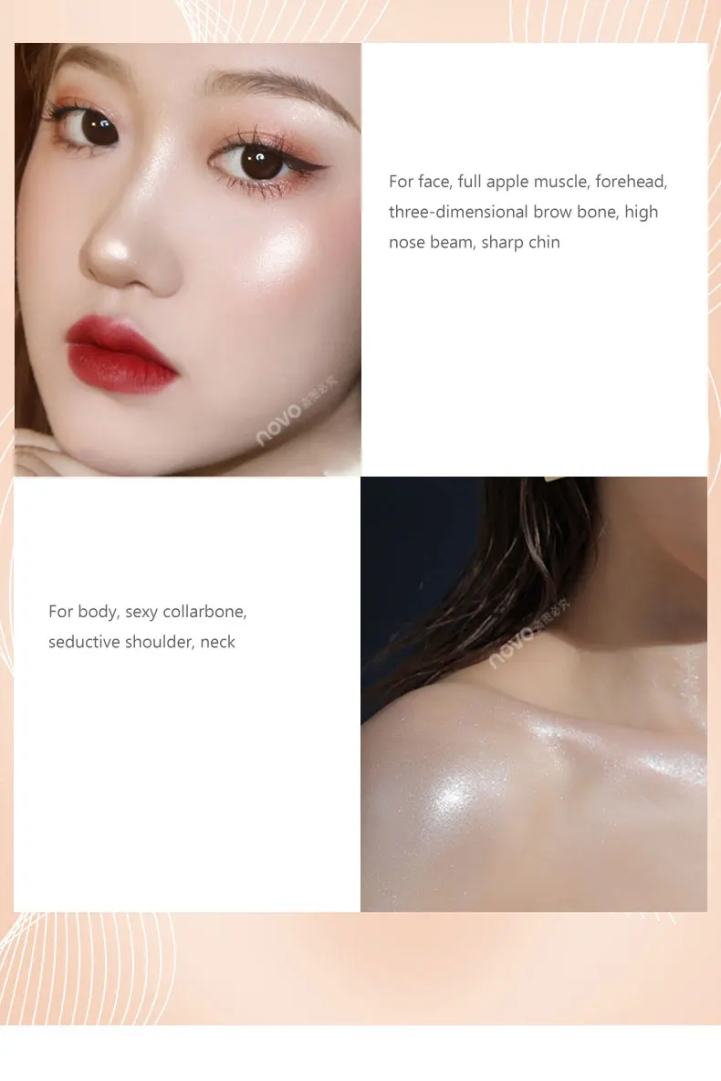 NOVO бренд Shimmer хайлайтер Серебряный Фиолетовый золотой макияж блеск лица и социальные тела можно использовать для осветления тона кожи микросвет рефракция