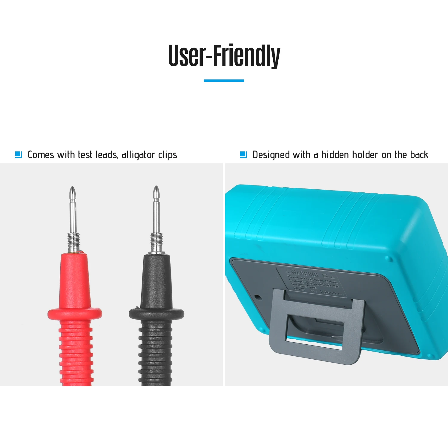 [Удобный для пользователя]Поставляется с тестовыми проводами, зажимами типа «крокодил»; И разработан со скрытым держателем на спине; Индикатор низкого заряда батареи/высокого напряжения.
