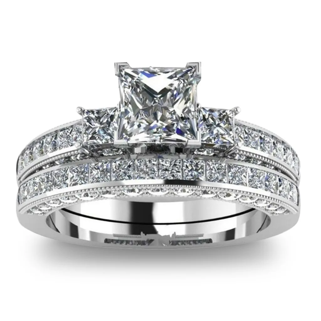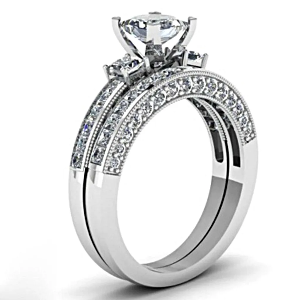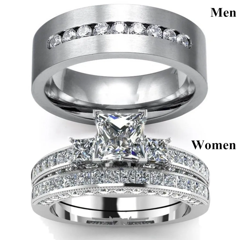 Couple Rings Vintage White Diamond Silver Engagement Wedding Band Ring Set