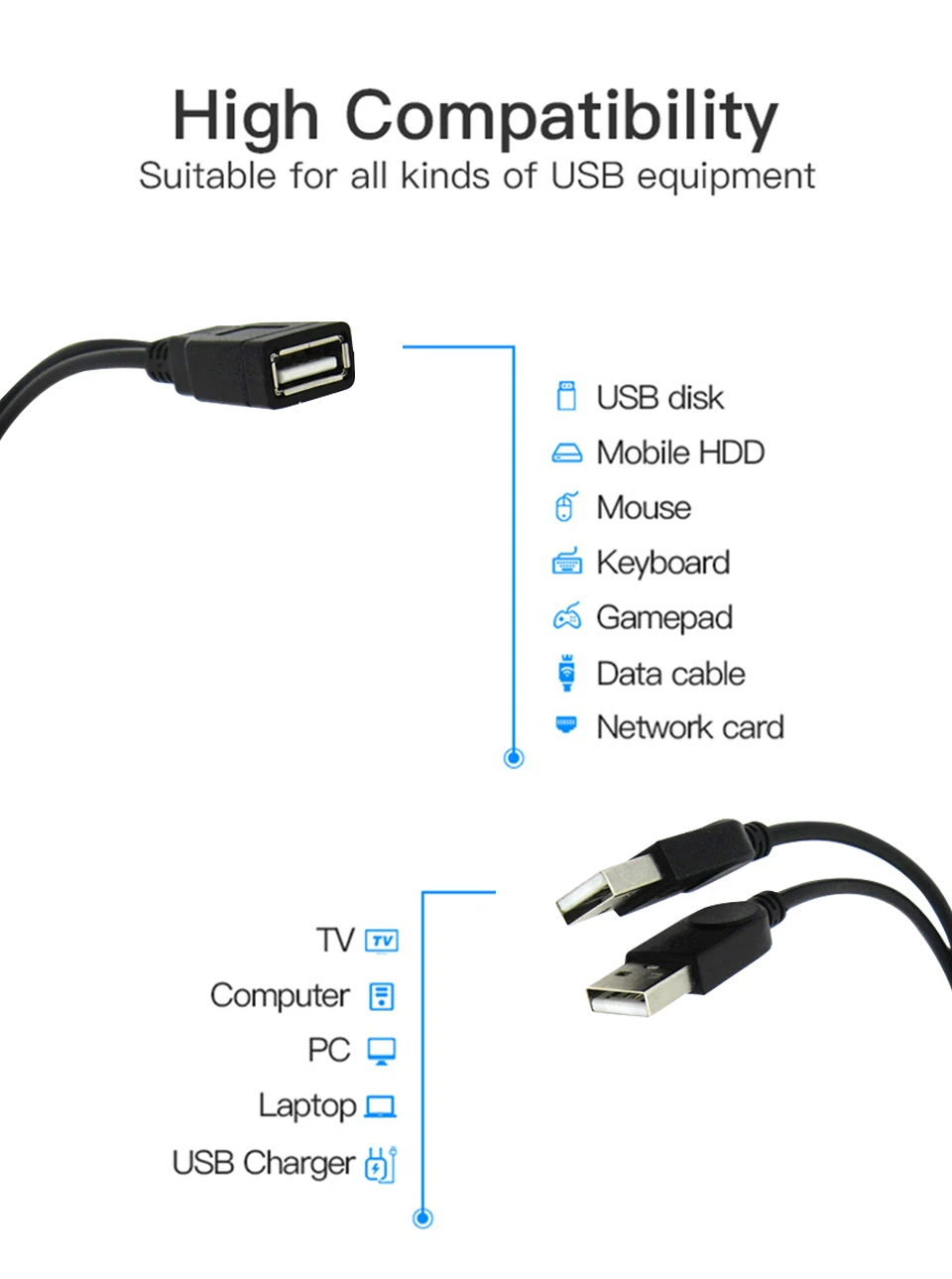 Кабель USB extendsion для решения проблемы настольных пользователей подключите все к рабочему столу Поддержка подключения нескольких устройств Зарядка телефона может быть расширена для поддержки подключения u-диска, клавиатуры, мыши, картридеров, принтеров, камер, мобильных жестких дисков для расширения использования компьютеров. Характеристика: Поддержка многооперационной системы, совместимость: Windows8/7/10/Vista/XP/2008/2003/2000/98