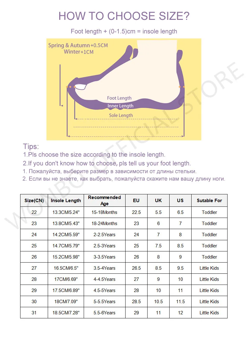 Поскольку все размеры детской обуви отличаются, при заказе детской обуви вы должны соответствовать нашим размерам и внутренней длине. Согласно длине стельки. (длина стельки = длина стопы + 1 см) Размер не стандартный, просто удобно для вас сделать заказ. Удобная длина стопы составляет около 1 см. И из-за длительного времени доставки ребенок быстро вырастет, пожалуйста, выберите обувь большего размера для вашего ребенка. Пожалуйста, выберите правильный размер. Вся обувь будет отправлена с пузырчатыми сумками, без коробок! Примечание: эта обувь не имеет переключателя, она будет светиться, когда ребенок будет ходить. Это не зарядка через USB, только встроенный аккумулятор, когда аккумулятор разрядится, он не будет сиять. Поскольку обувь не подключена к USB, она излучает светильник, что может привести к тому, что с течением времени аккумулятор накапливает светильник. Это нормально, что один светильник un, другой светильник или один светильник, другой-темный. Если есть проблема с светильник, такой как другой светильник s в обеих туфлях, один светильник вверх, а другой нет или цвет не сбалансирован, мы не заботимся о проблеме качества, и это не может быть проблемой после продажи.