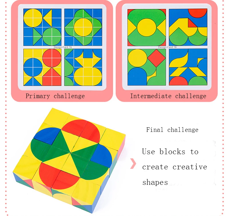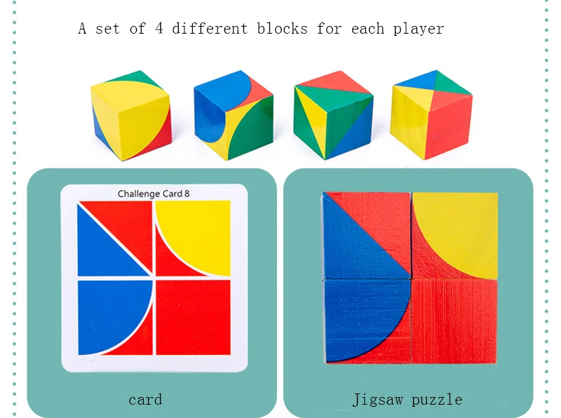 Игра 1: Дайте каждому игроку набор из 4 различных блоков, нарисуйте карту вызова, поместите ее там, где все видят, и быстро используйте его 4 квадрата, чтобы создать шаблон, чтобы выиграть. Игра 2: Отправьте каждому игроку набор из 4 разных блоков, нарисуйте карту вызова и поместите ее там, где вы его видите. После того, как все запомнят в течение 10 секунд, переверните карту вызова на обратную сторону. Быстро через память и подсказка на задней части карты вызова, те, кто делает шаблон с их 4 квадратами выиграть. Игра 3: С основой скорости и памяти, используйте 16 деревянных блоков для создания различных творческих узоров.