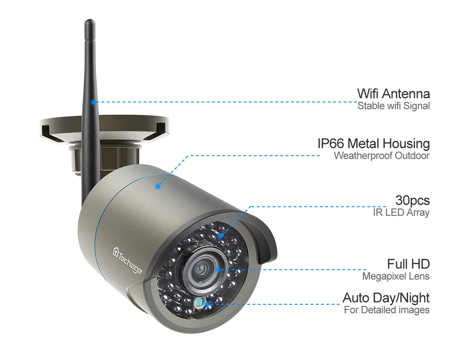 1, 8-канальный NVR дизайн, поддержка подключения до 8 шт камер, вы можете купить Techage Беспроводные ip камеры для расширения вашей системы видеонаблюдения 2, все камеры встроены в микрофон, поддержка звукозаписи