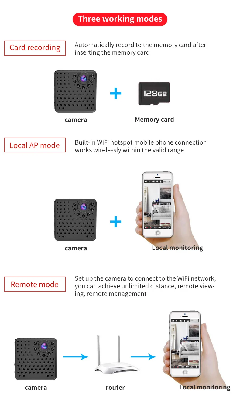 ● Запись карты: автоматическая запись на карту памяти после sert ● Локальный режим AP: Встроенный Wi-Fi точка доступа мобильный телефон подключение работает без проводов в допустимом диапазоне ● Удаленный режим: Настройте камеру для подключения к сети Wi-Fi, вы можете достичь неограниченного расстояния, удаленного просмотра, удаленного управления