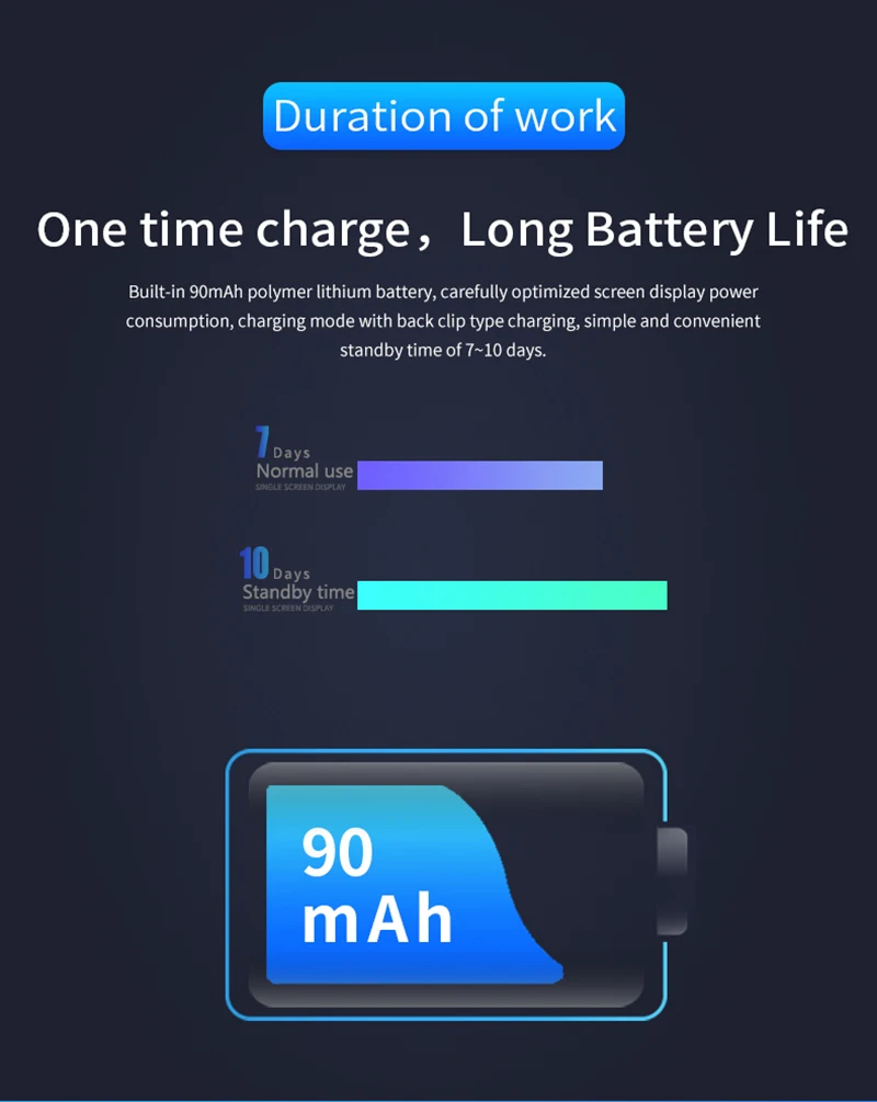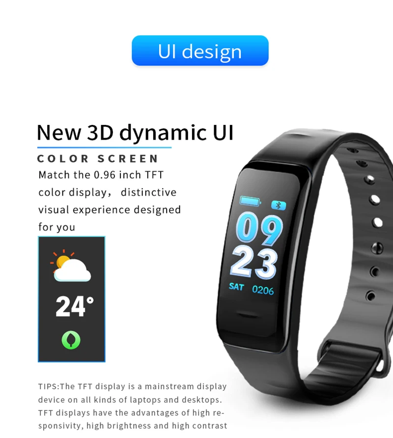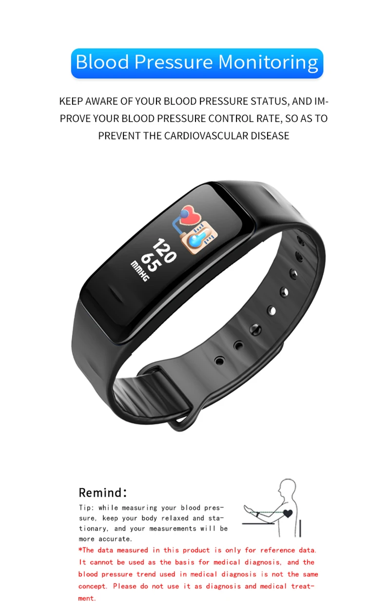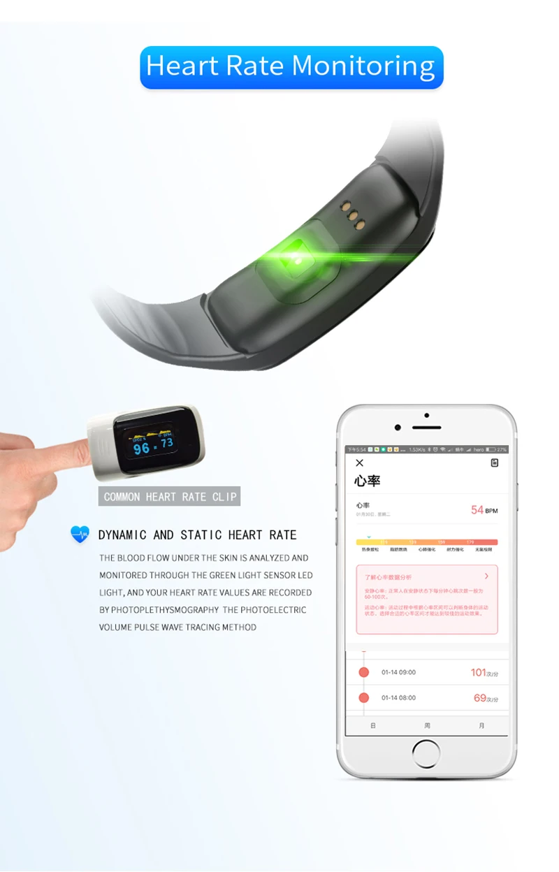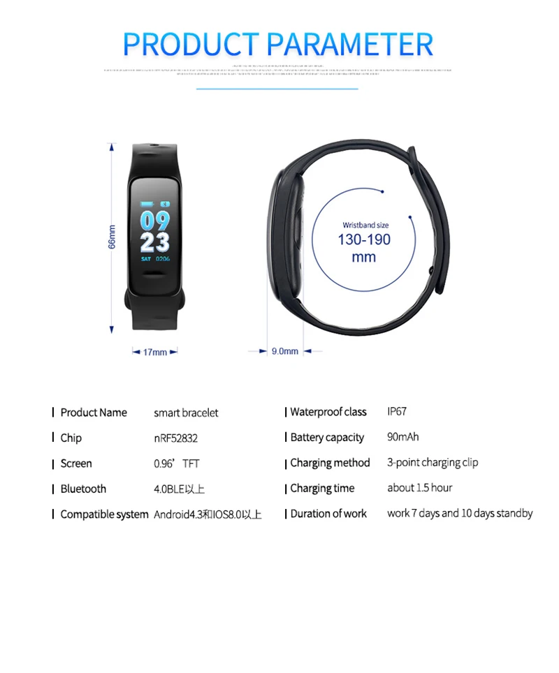 Введение функции: Динамический пульс и Автоматический монитор сна: Фитнес-трекер отслеживает динамическую частоту сердечных сокращений, загружая данные в реальном времени сердечных сокращений в приложение для телефона. Также поддерживается автоматический мониторинг сна, он записывает глубокий, легкий, время бодрствования и все время сна. Все данные о состоянии здоровья представлены в таблице, четко подтверждающей ваш Физический Статус в течение всего дня. Одна зарядка дает вам до 7 дней рабочего времени (Примечание: аккумулятор длится 5-7 дней при тяжелой нагрузке; Батарея работает 7-10 дней при легкой загрузке) Основные функции: 1. Новый 3D динамический пользовательский интерфейс, поддержка сообщений (SMS, Facebook, Twitter и другие основные напоминания о социальных приложениях) 2. Мониторинг здоровья: Динамический и статический пульс, динамическое и статическое кровяное давление, динамический и статический кислород в крови, Контроль усталости, мониторинг сна, подсчет шагов, потребление калорий, расстояние 3. Режим работы: мониторинг в реальном времени количества шагов, калорий, расстояния, частоты сердечных сокращений, движения 4. Отображение информации о вызывающем абоненте, длительное нажатие, чтобы отклонить вызов 5. Сидячая вибрация, вибрация будильника, удаленная камера, управление музыкой Основные параметры: 1. Экран: 0,96 дюймовый HD цветной экран 2. Bluetooth: 4.0BLE 3. Уровень водонепроницаемости: IP67 4. Продолжительность работы в режиме ожидания: около 7 дней 5. Цвет ремешка: черный, синий, красный, зеленый, оранжевый, фиолетовый 6. Совместимая телефонная система: Android 4,4 выше, IOS 8,0 выше 7. Язык браслета: русский, английский, испанский, корейский, японский, французский, арабский, украинский 8. Язык приложения: английский, корейский, немецкий, испанский, японский, французский, итальянский, русский, португальский, арабский, украинский, тайский 9. Приложение: "Da Fit" Упаковочный лист: Умный Браслет * 1 Зарядный кабель * 1 Спецификация * 1 Упаковочная коробка * 1 Примечание: * При первом использовании этого оборудования аккумулятор не имеет питания. Пожалуйста, зарядите его перед использованием. * Это непрофессиональное медицинское оборудование, частота сердечных сокращений, данные о кровяном давлении только для наблюдения за изменением после физических упражнений, только в качестве справки. Пожалуйста, не используйте его в качестве диагностики и медицинского лечения. * Часы поддерживают водонепроницаемость, вы можете носить их под дождем, мыть руки, лазание и другие виды спорта, но не помещайте их в горячую воду или плавание и душ.