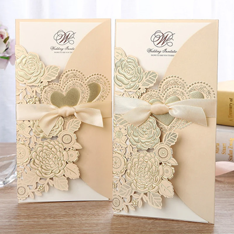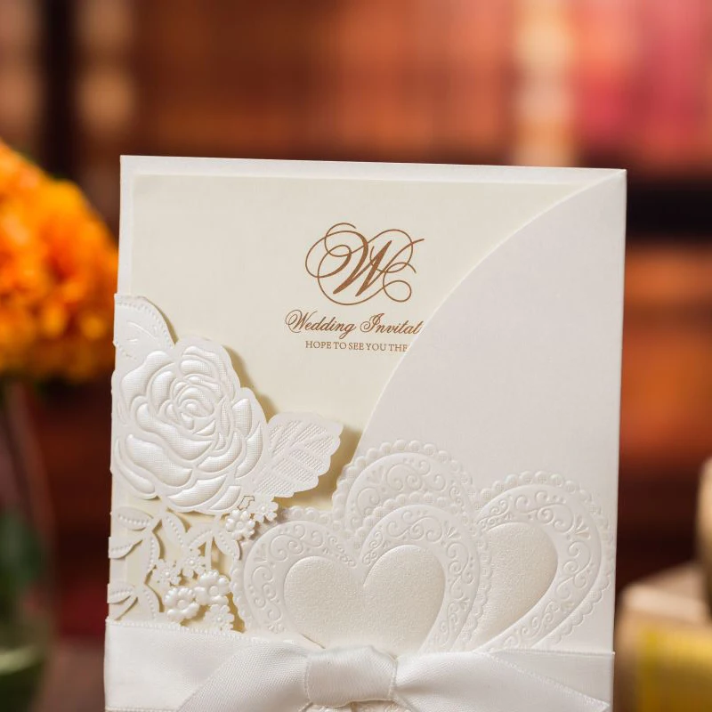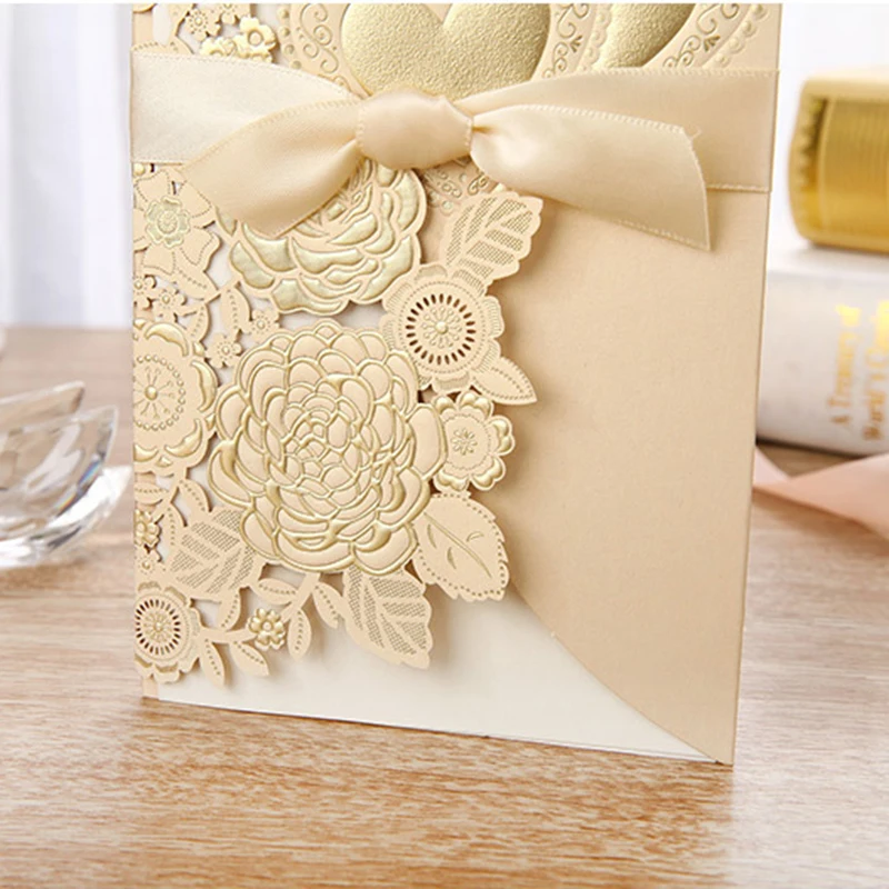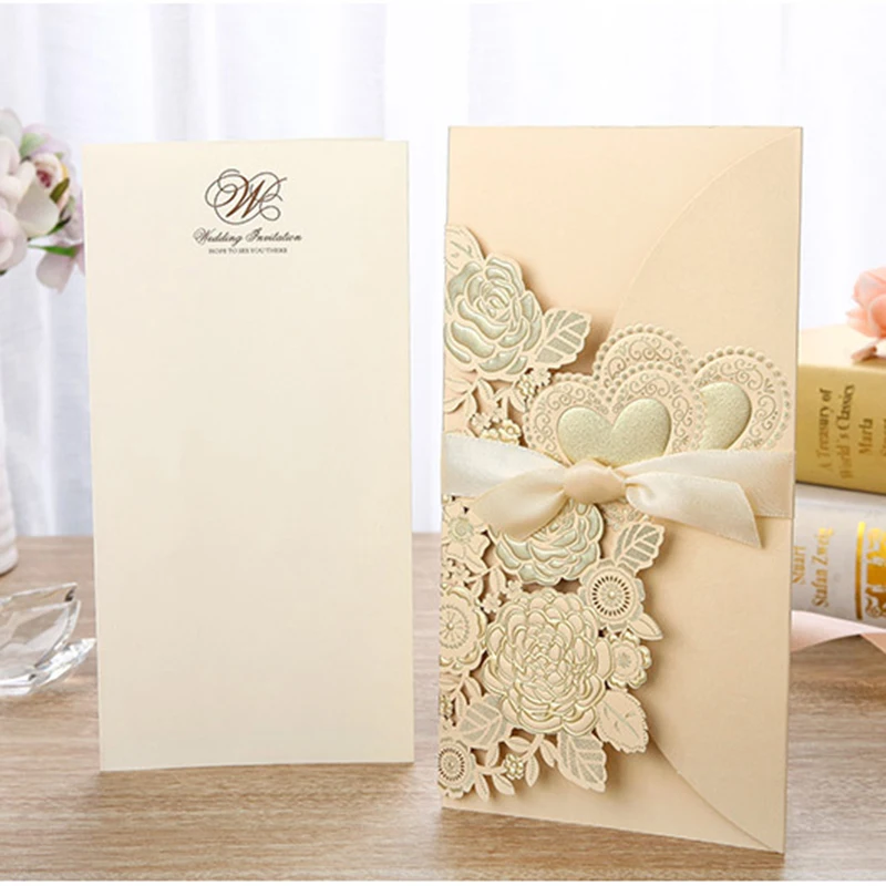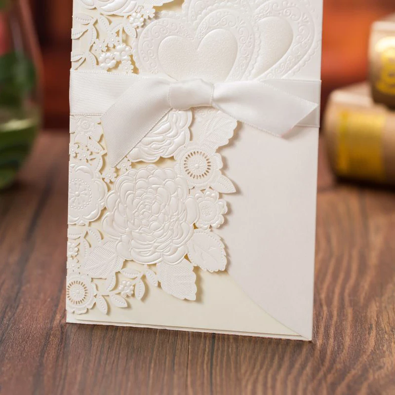 50 шт., лазерная резка, свадебные приглашения, открытки, розовое сердце, открытки на заказ, конверты с лентой, Свадебные вечерние принадлежности